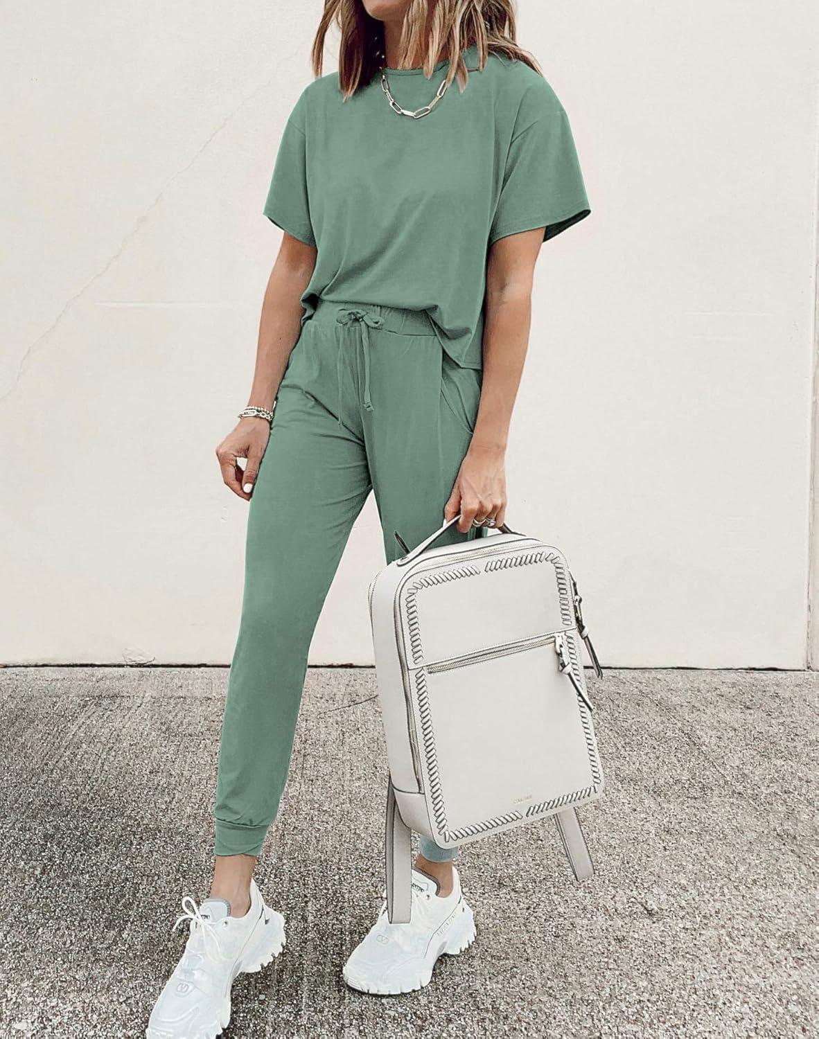 PRETTYGARDEN Women's Two Piece Sets 2025 Summer Spring Jogger Pants Travel Vacation Lounge Outfits Airplane Matching Clothes(Green)
