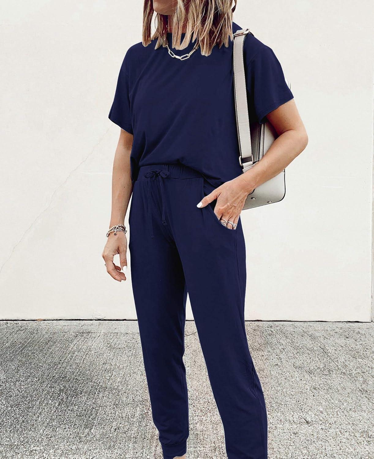PRETTYGARDEN Women's Two Piece Sets 2025 Summer Spring Jogger Pants Travel Vacation Lounge Outfits Airplane Matching Clothes(Navy)