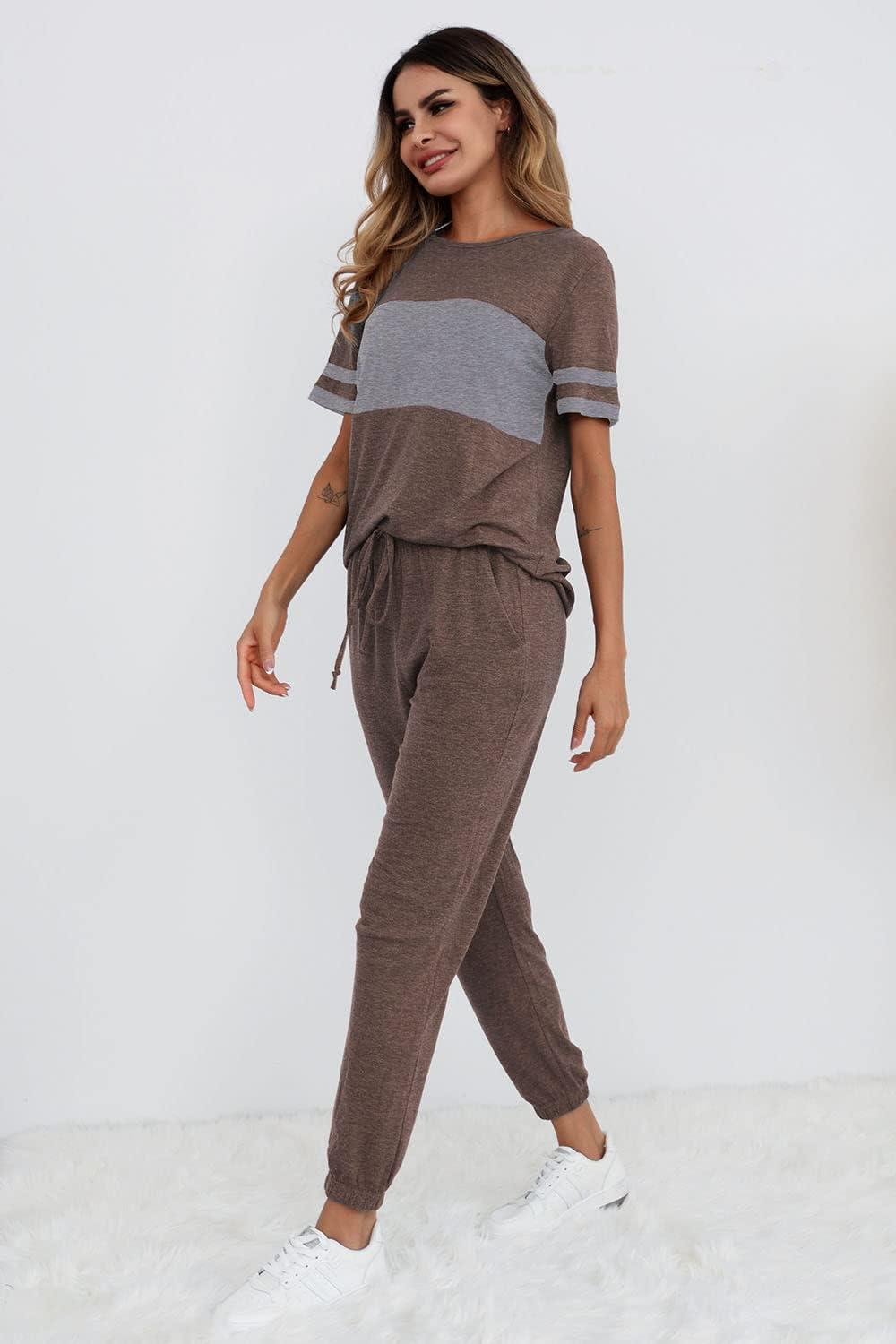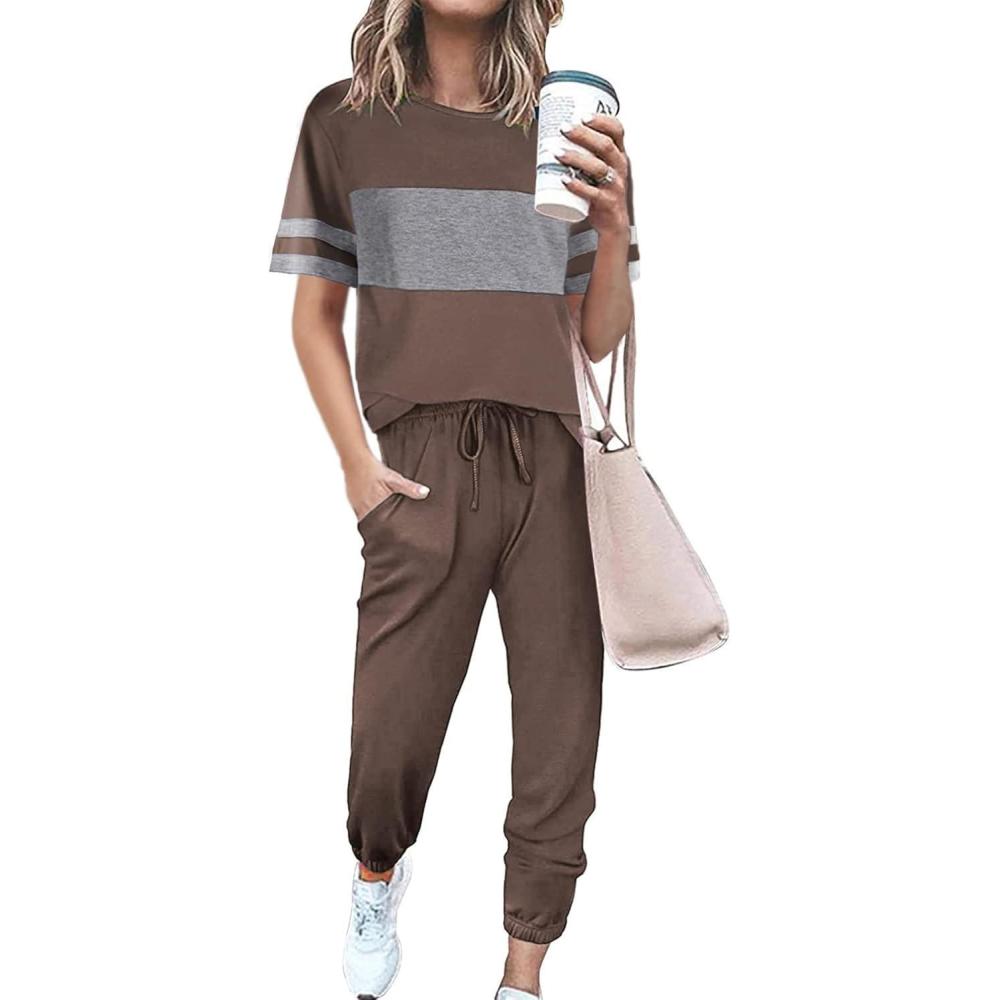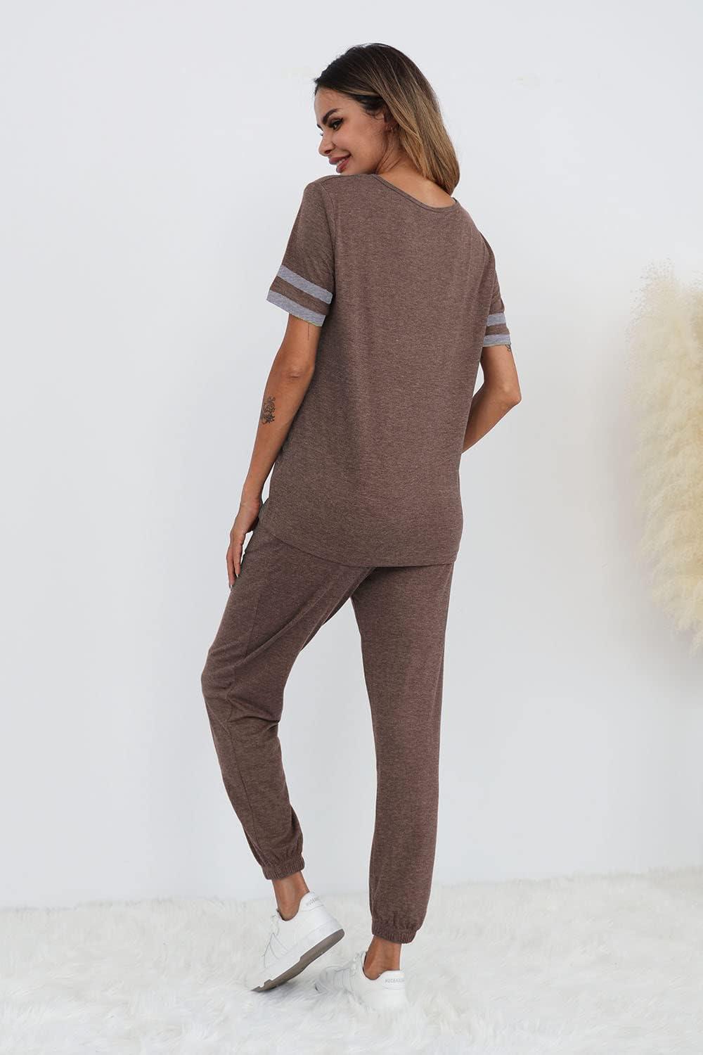 imagePRETTYGARDEN Womens Two Piece Sets 2025 Summer Spring Jogger Pants Travel Vacation Lounge Outfits Airplane Matching ClothesStriped Dark Khaki