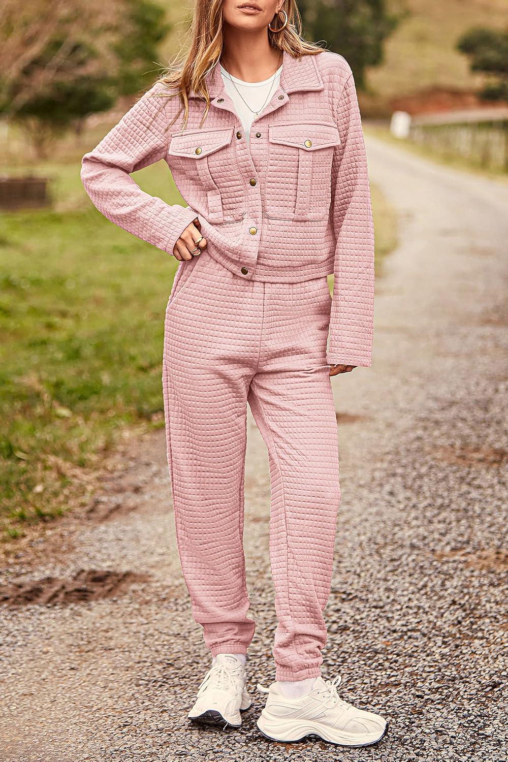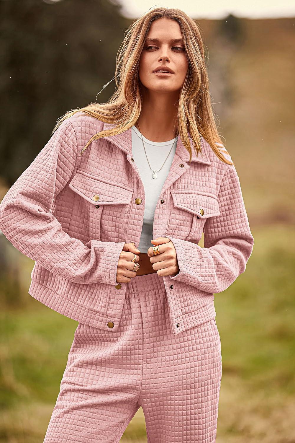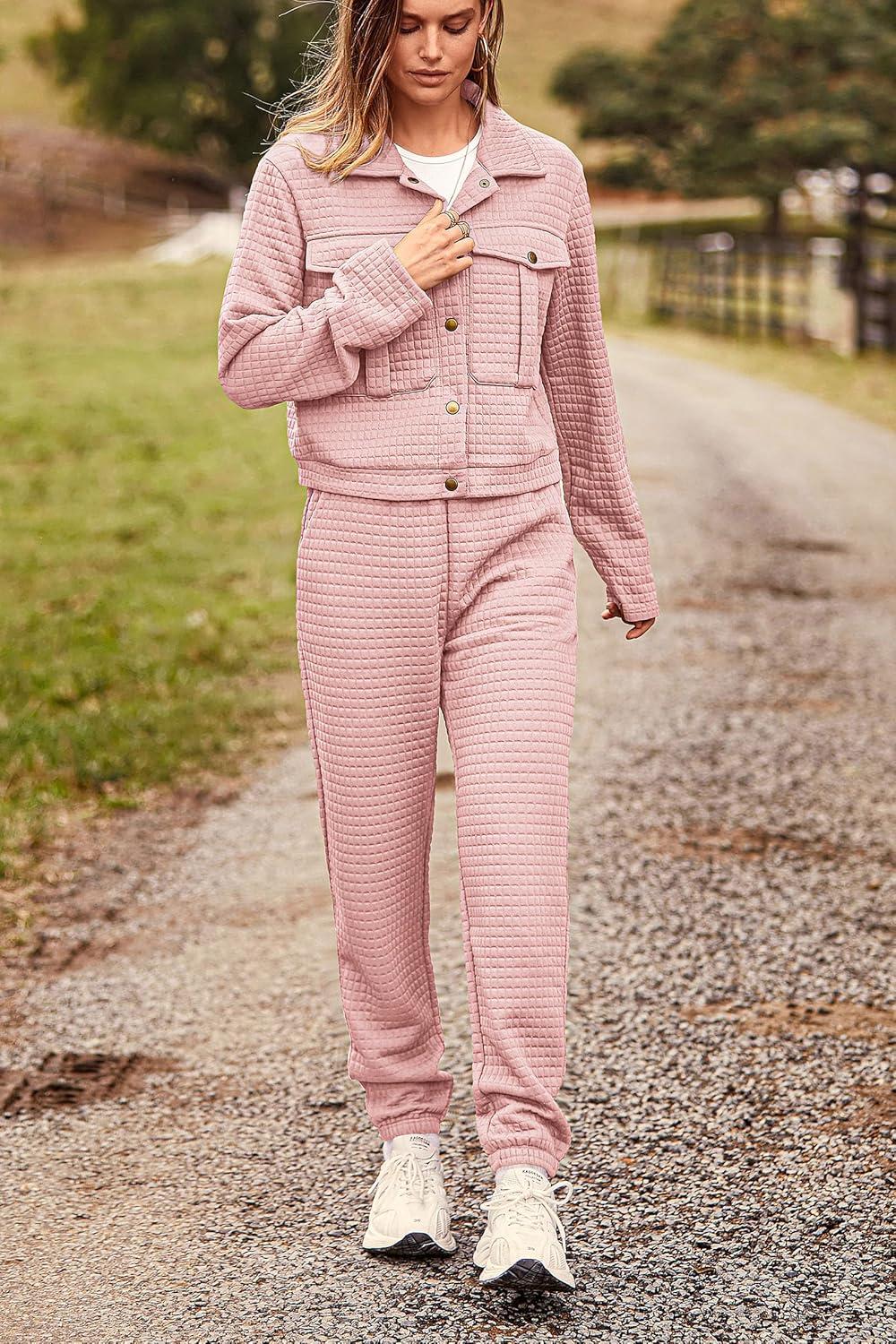 PRETTYGARDEN Womens Two Piece Sets Fall 2025 Long Sleeve Button Down Shacket Jacket Long Sweatpants Tracksuit Winter Clothes(Pink)