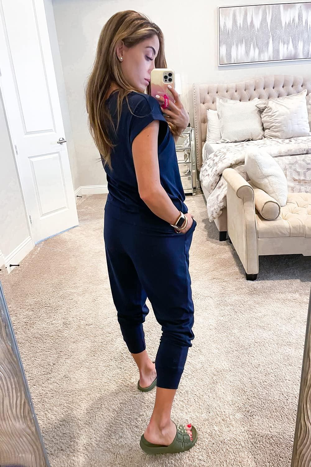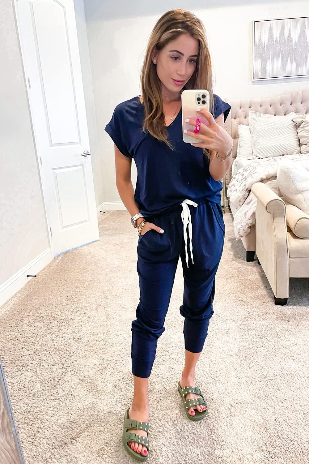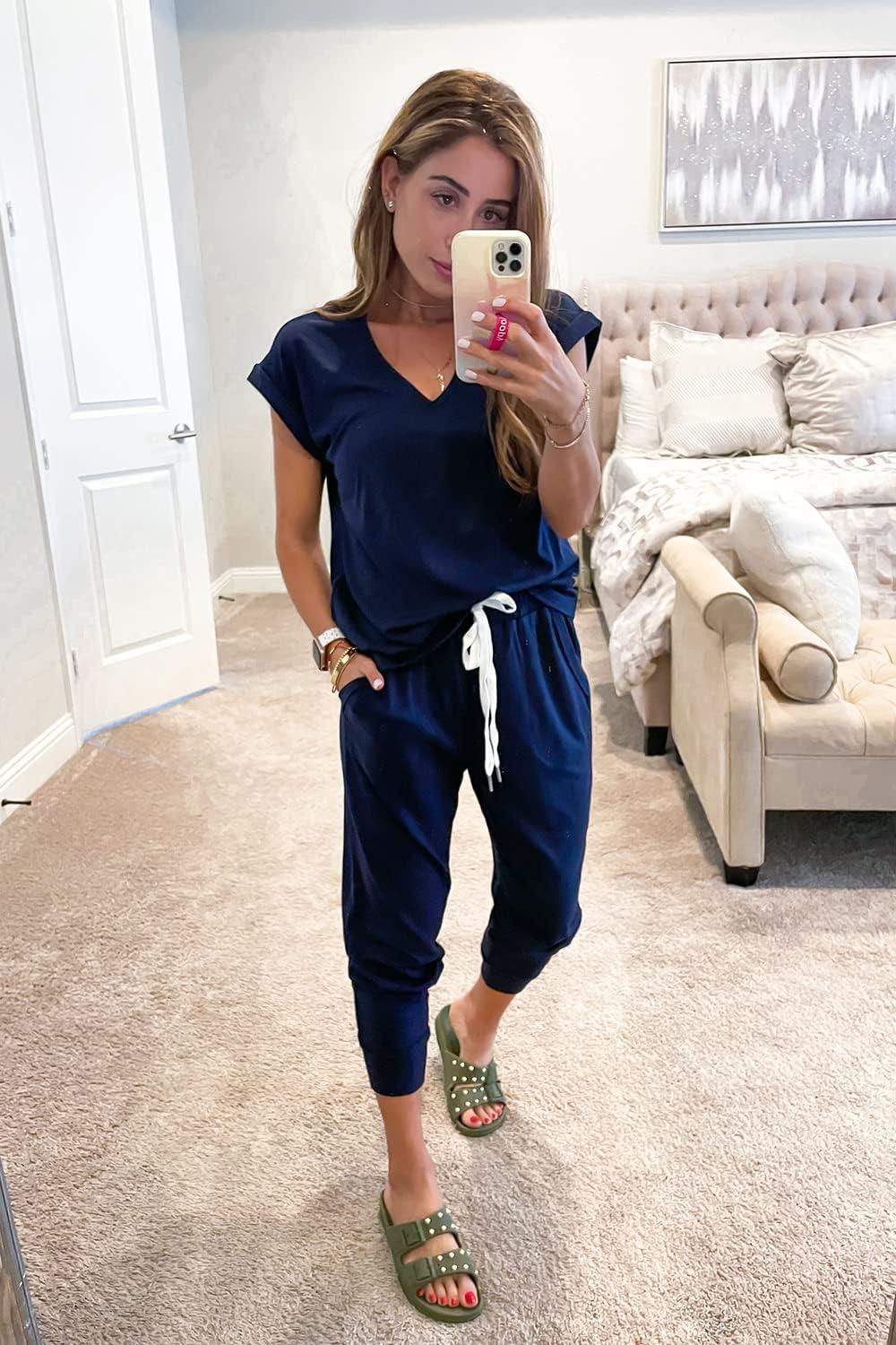 PRETTYGARDEN Women's Two Piece Tracksuit Casual Summer V Neck Short Sleeve Tops Drawstring Jogger Pants Lounge Outfit Sets(Dark Blue)