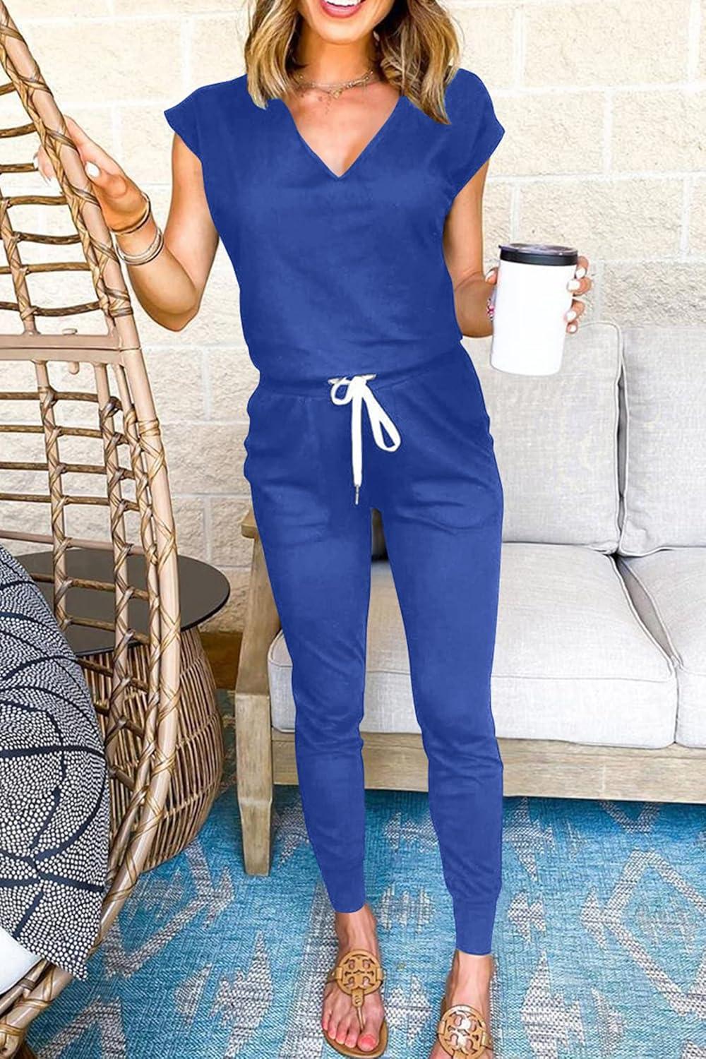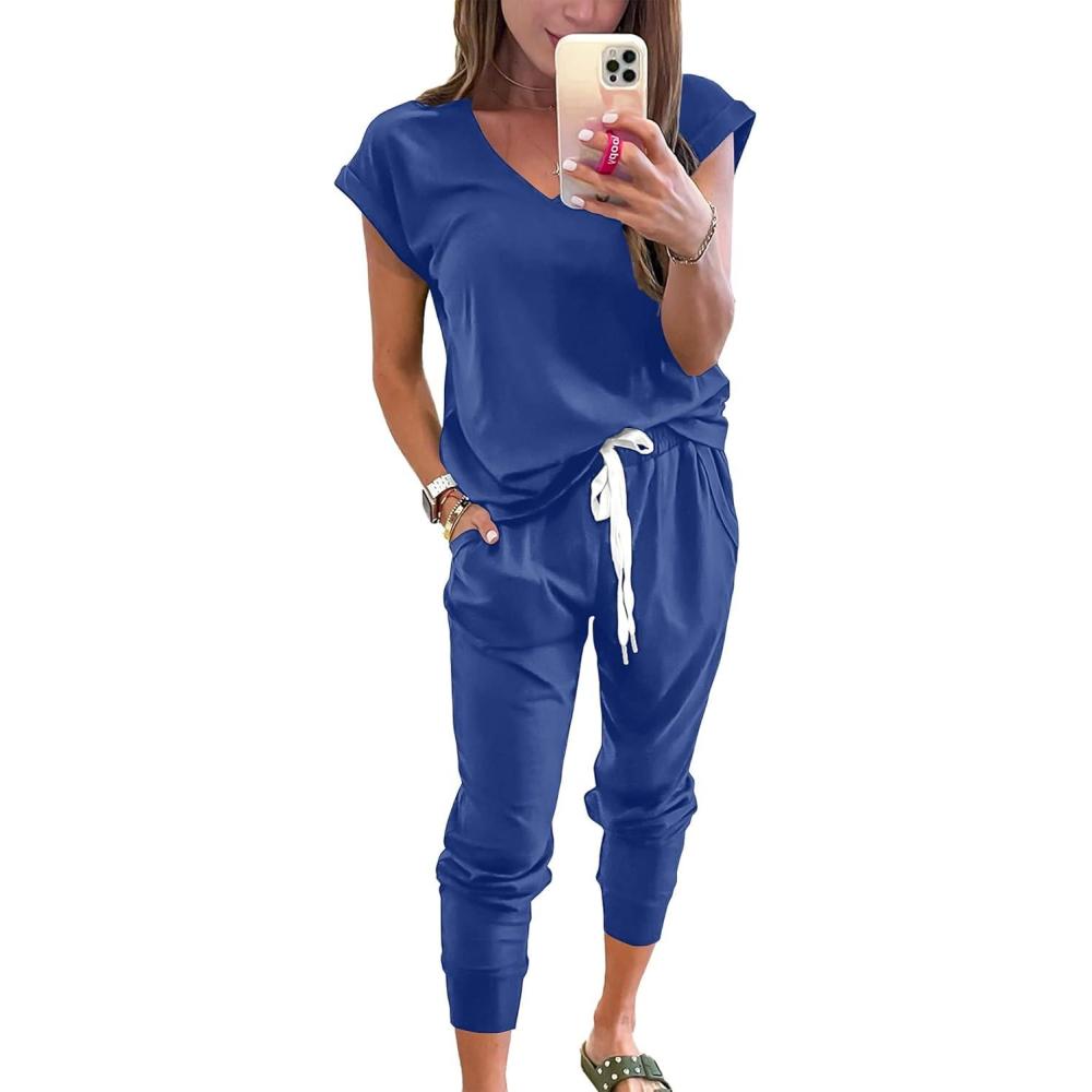 PRETTYGARDEN Women's Two Piece Tracksuit Casual Summer V Neck Short Sleeve Tops Drawstring Jogger Pants Lounge Outfit Sets(Denim Blue)