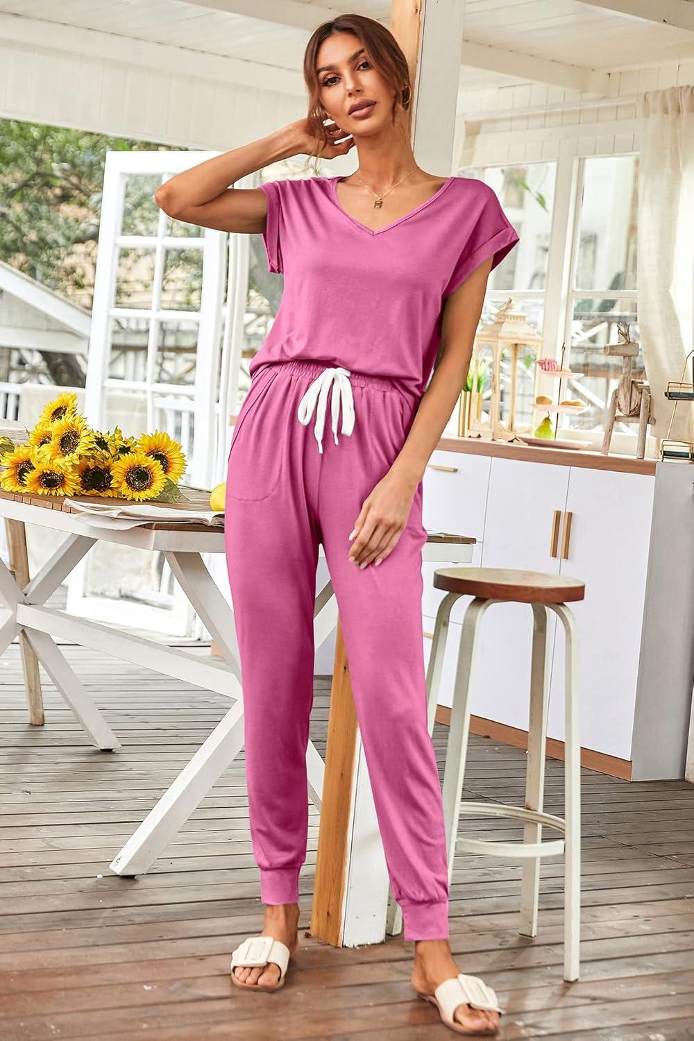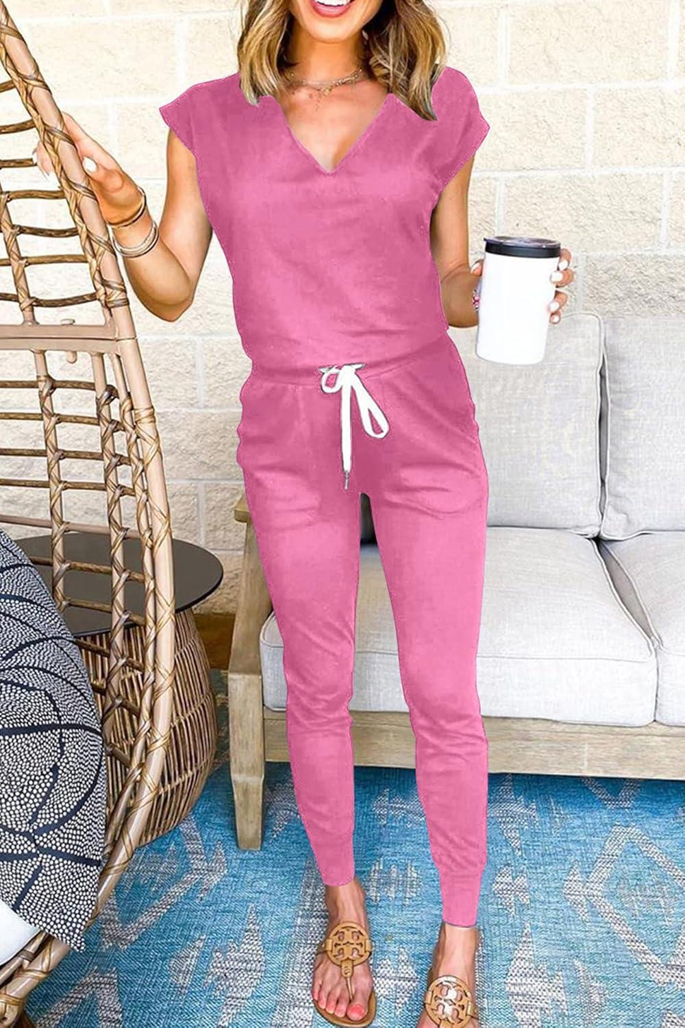 PRETTYGARDEN Women's Two Piece Tracksuit Casual Summer V Neck Short Sleeve Tops Drawstring Jogger Pants Lounge Outfit Sets(Pink)