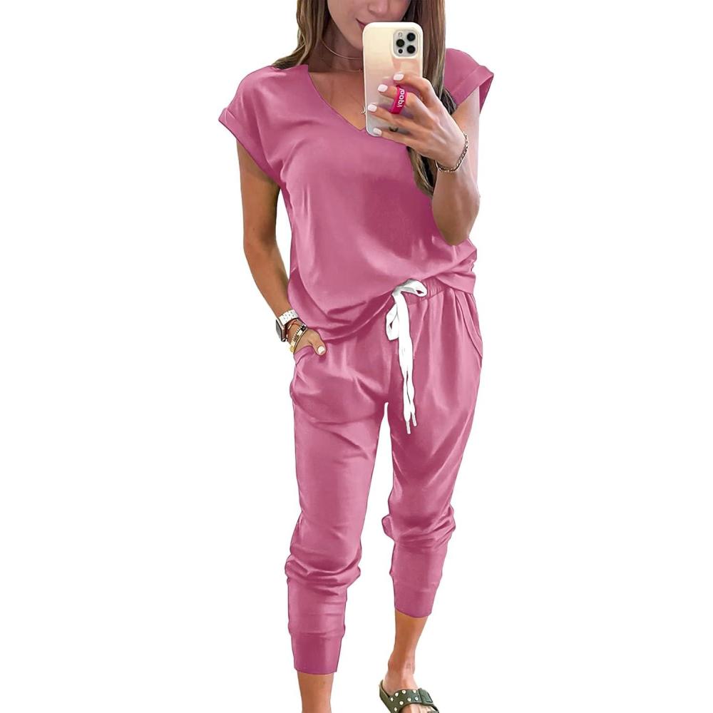 PRETTYGARDEN Women’s Two Piece Tracksuit Casual Summer V Neck Short Sleeve Tops Drawstring Jogger Pants Lounge Outfit Sets(Pink)
