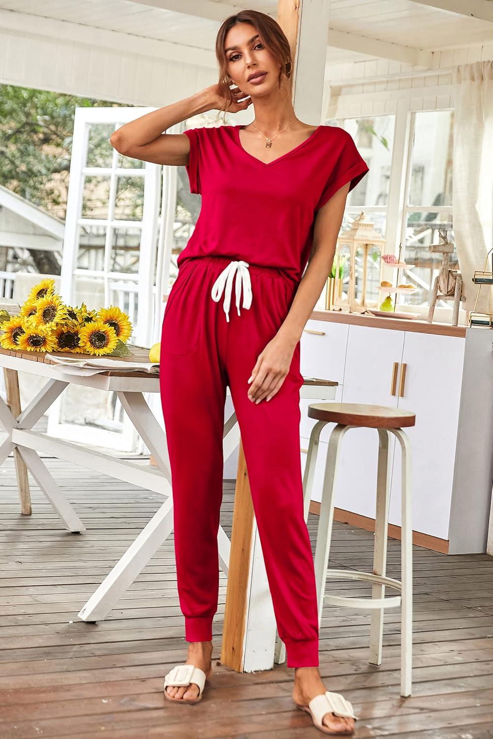 PRETTYGARDEN Women's Two Piece Tracksuit Casual Summer V Neck Short Sleeve Tops Drawstring Jogger Pants Lounge Outfit Sets(Red)