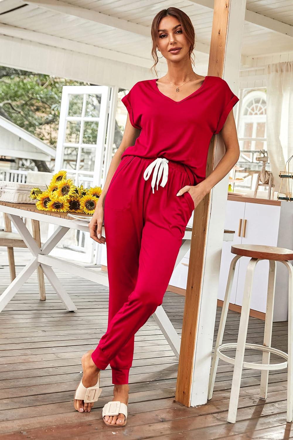 PRETTYGARDEN Women’s Two Piece Tracksuit Casual Summer V Neck Short Sleeve Tops Drawstring Jogger Pants Lounge Outfit Sets(Red)