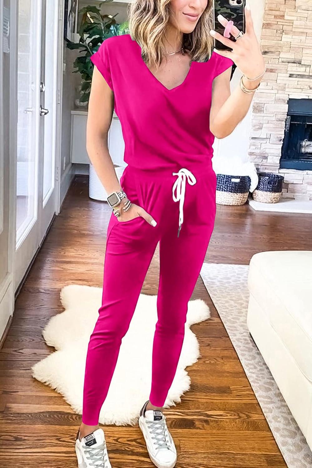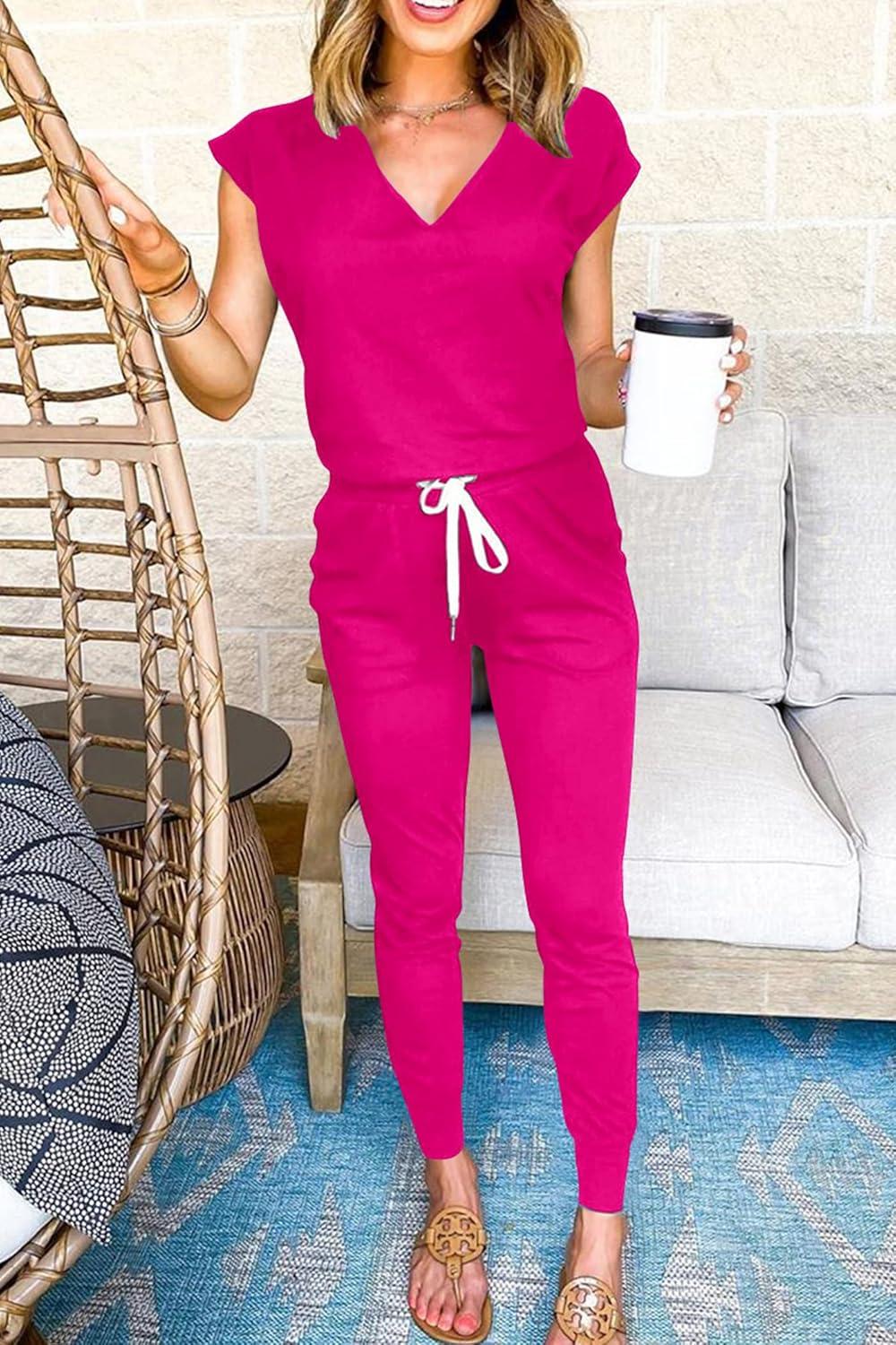 PRETTYGARDEN Women's Two Piece Tracksuit Casual Summer V Neck Short Sleeve Tops Drawstring Jogger Pants Lounge Outfit Sets(Rose Red)