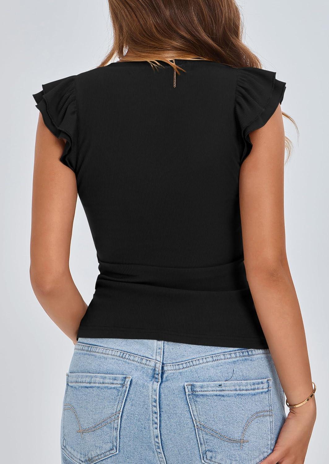 PRETTYGARDEN Womens V Neck Summer Tops Ruffle Sleeveless Slim Fit T Shirts Going Out Casual Blouses 2025(Black)
