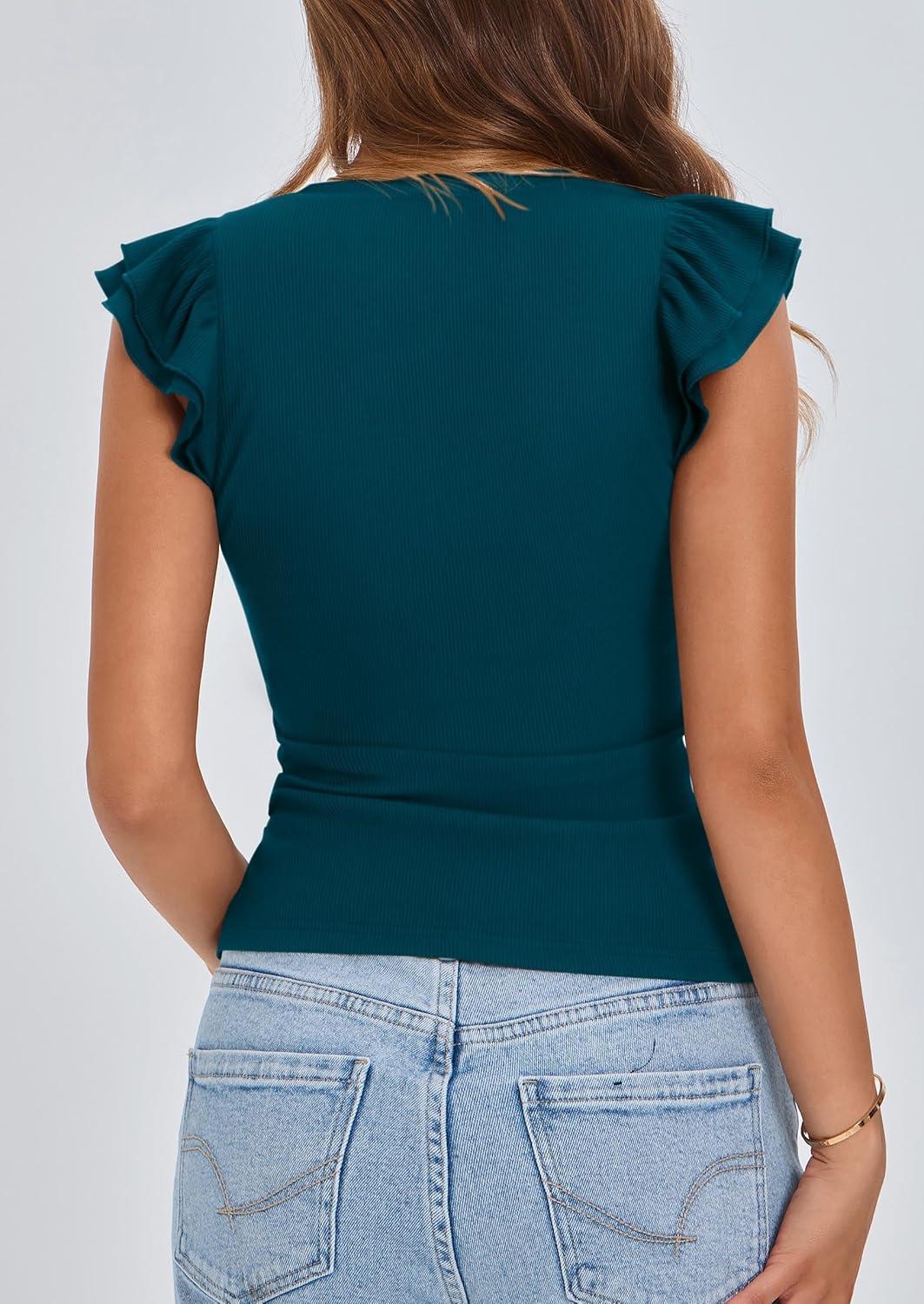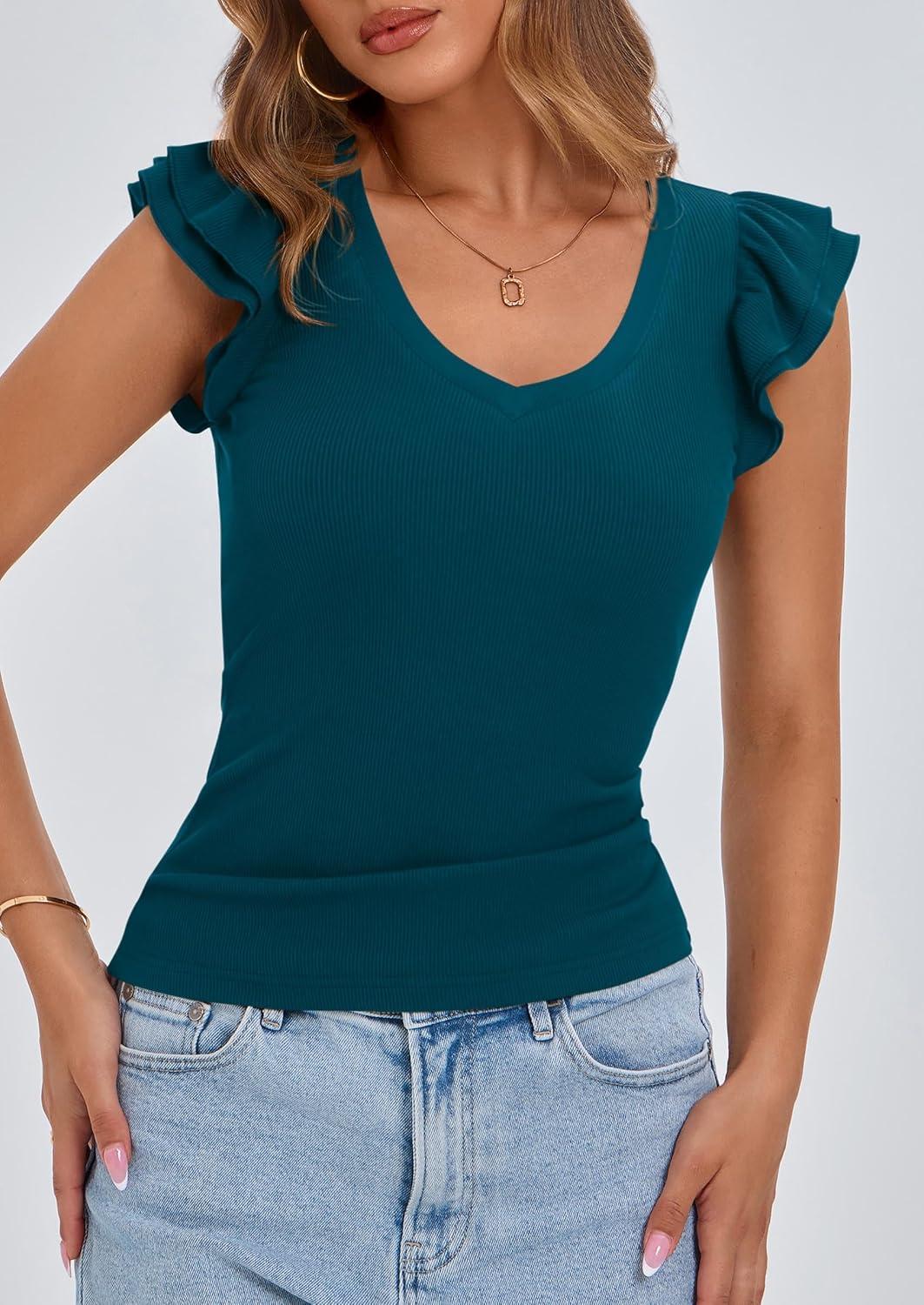 PRETTYGARDEN Womens V Neck Summer Tops Ruffle Sleeveless Slim Fit T Shirts Going Out Casual Blouses 2025(Dark Blue)
