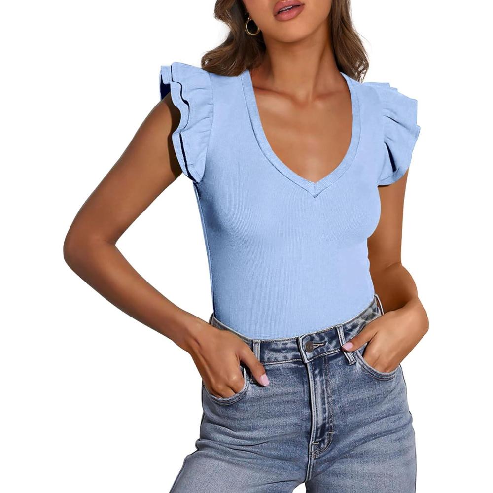 PRETTYGARDEN Womens V Neck Summer Tops Ruffle Sleeveless Slim Fit T Shirts Going Out Casual Blouses 2025(Light Blue)