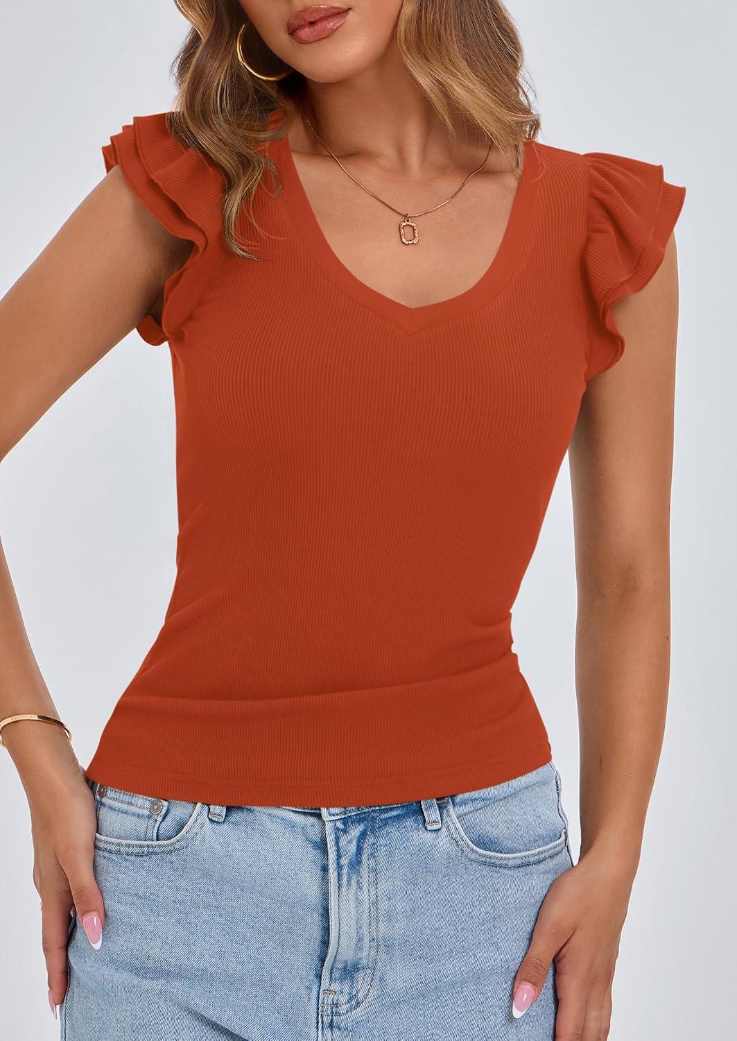 PRETTYGARDEN Womens V Neck Summer Tops Ruffle Sleeveless Slim Fit T Shirts Going Out Casual Blouses 2025(Rust Red)