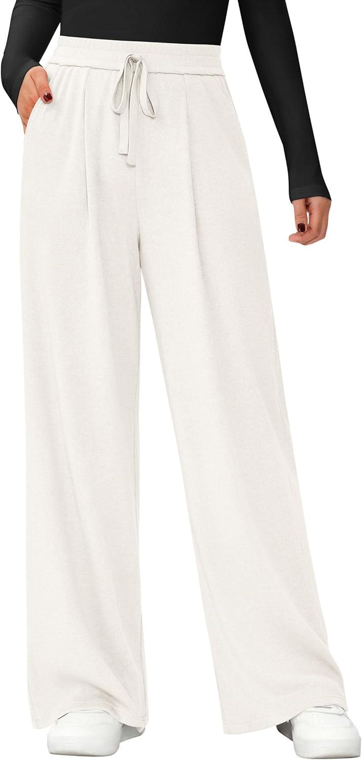 PRETTYGARDEN Women's Wide Leg Pants 2025 Fall Elastic High Waisted Knit Casual Lounge Palazzo Pant Trousers with Pockets(White)
