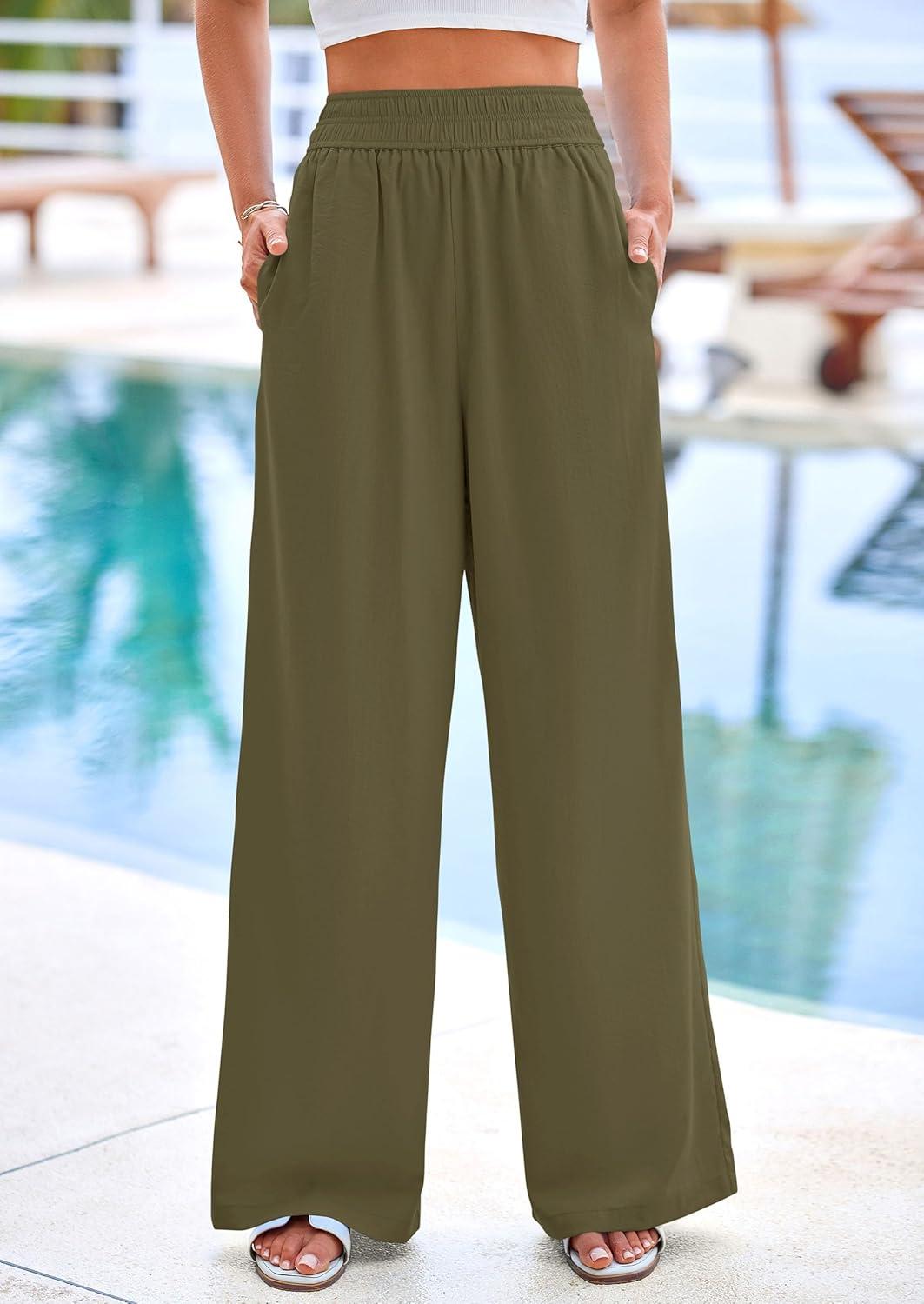 PRETTYGARDEN Womens Wide Leg Pants Casual 2025 Elastic Waist Loose Flowy Palazzo Pants Trousers with Pockets(Army Green)