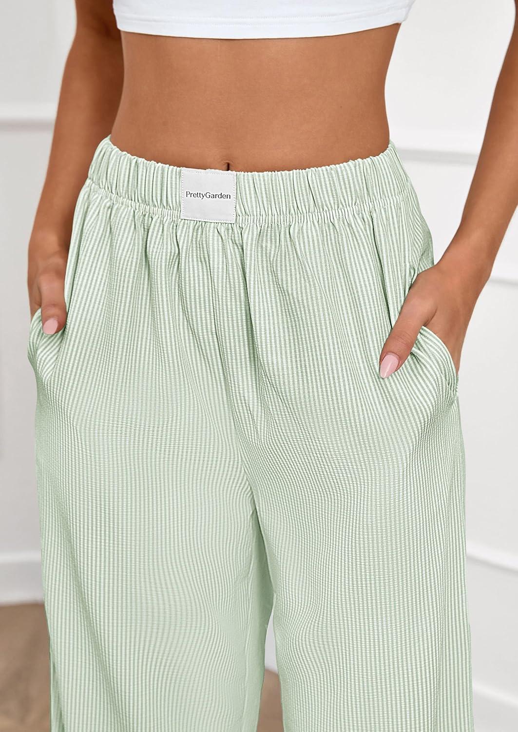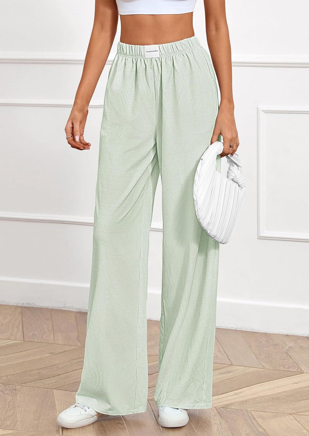 PRETTYGARDEN Women's Wide Leg Striped Pants 2025 Fall Casual High Waisted Baggy Palazzo Lounge Trousers Fashion Bottoms(Light Green)