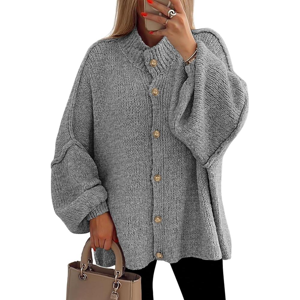 PRETTYGARDEN Women's Winter Button Down Cardigan Sweaters Mock Neck Lantern Long Sleeve Chunky Knit Jacket Trendy Outerwear(Grey)