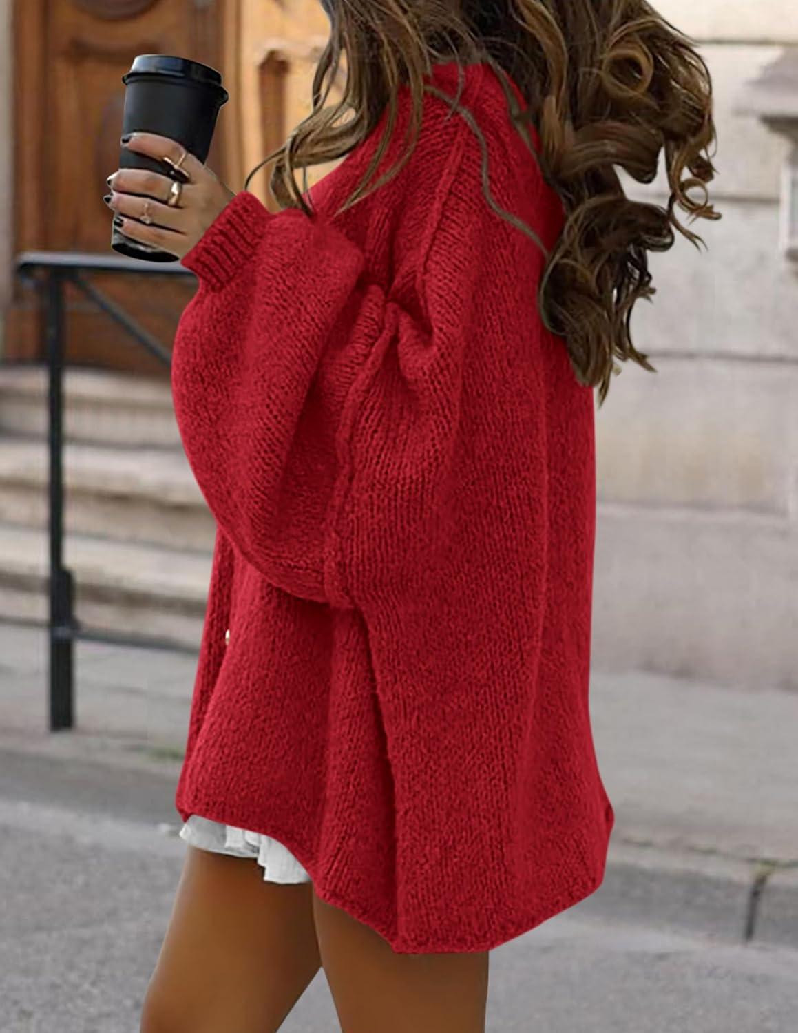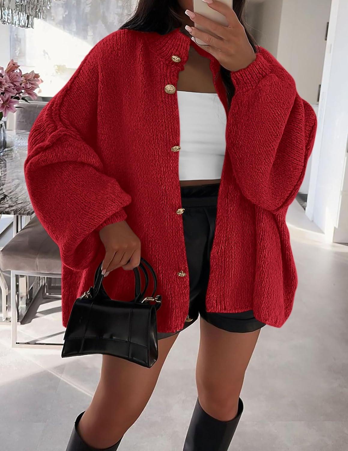 PRETTYGARDEN Women's Winter Button Down Cardigan Sweaters Mock Neck Lantern Long Sleeve Chunky Knit Jacket Trendy Outerwear(Jujube Red)