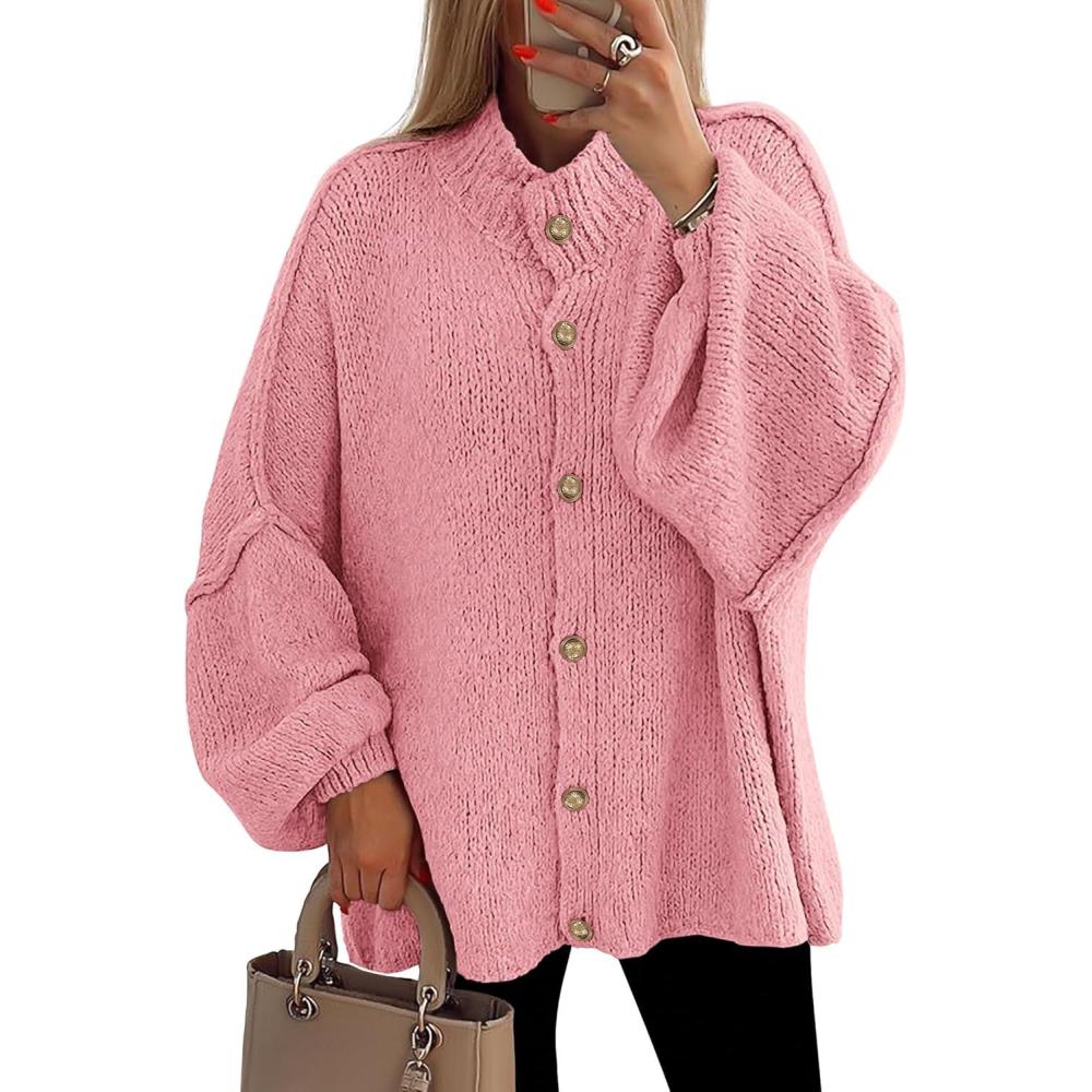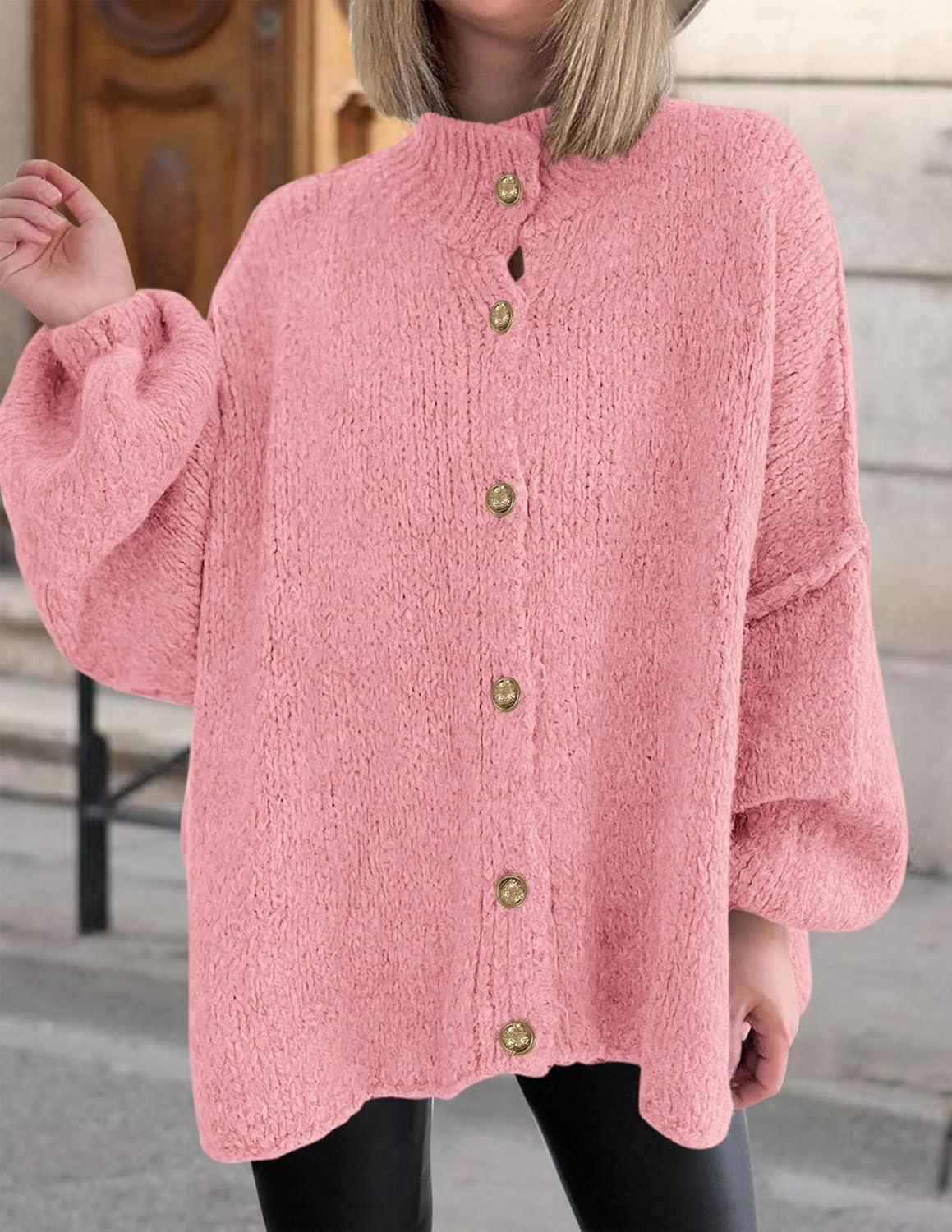 PRETTYGARDEN Women's Winter Button Down Cardigan Sweaters Mock Neck Lantern Long Sleeve Chunky Knit Jacket Trendy Outerwear(Pink)