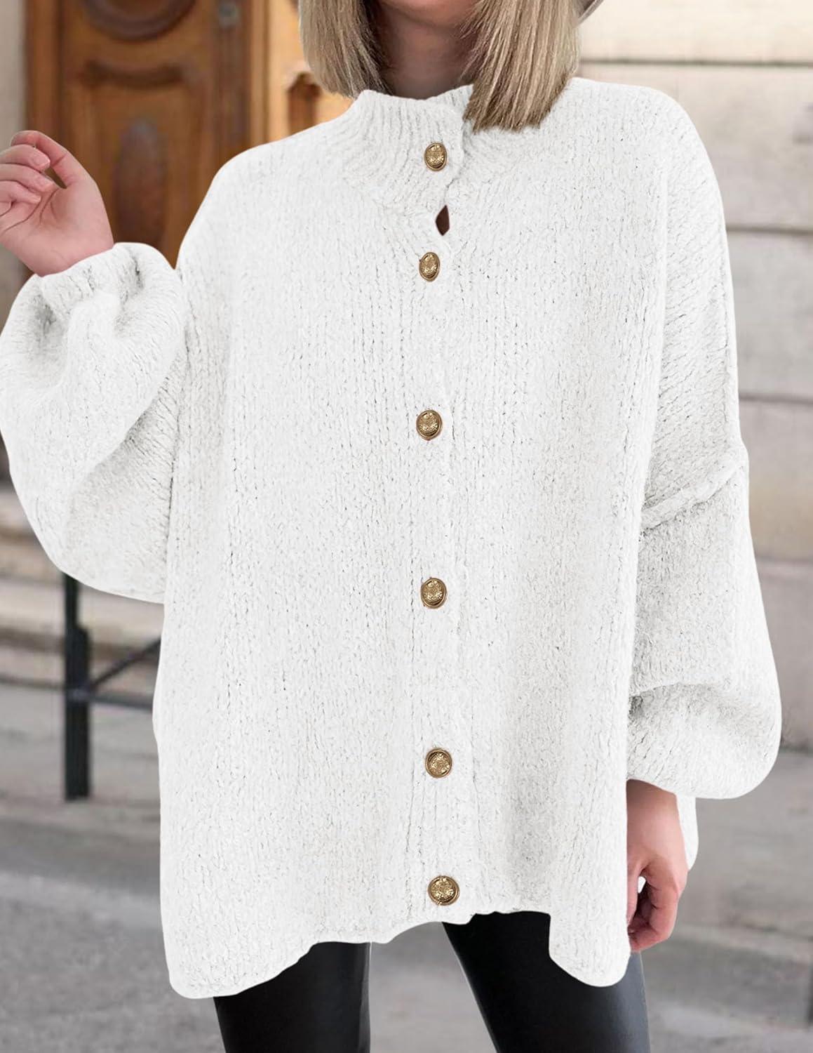 PRETTYGARDEN Women’s Winter Button Down Cardigan Sweaters Mock Neck Lantern Long Sleeve Chunky Knit Jacket Trendy Outerwear(White)