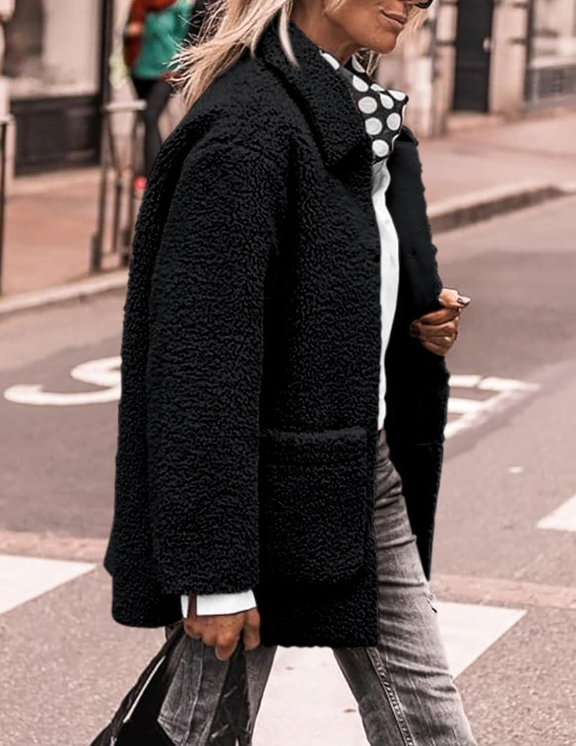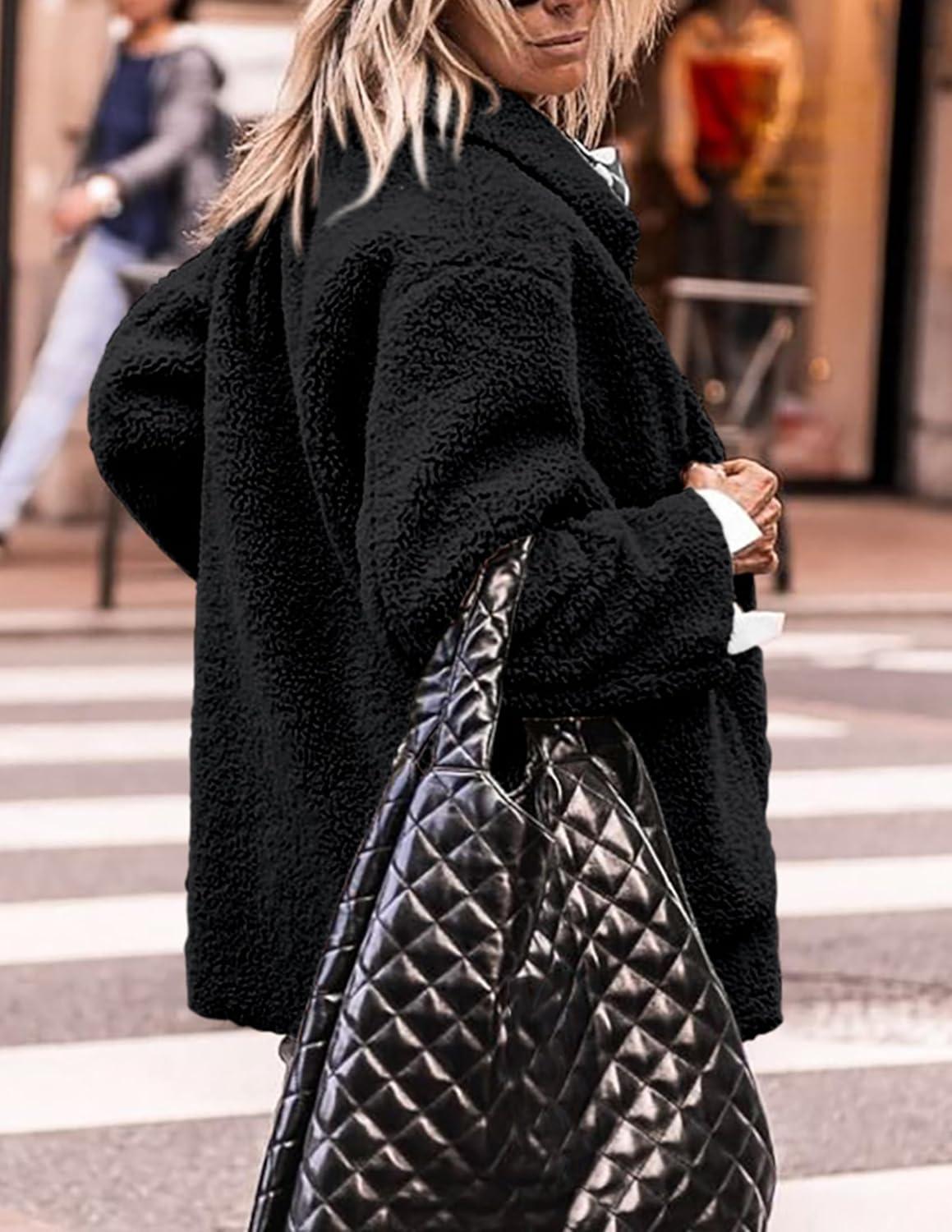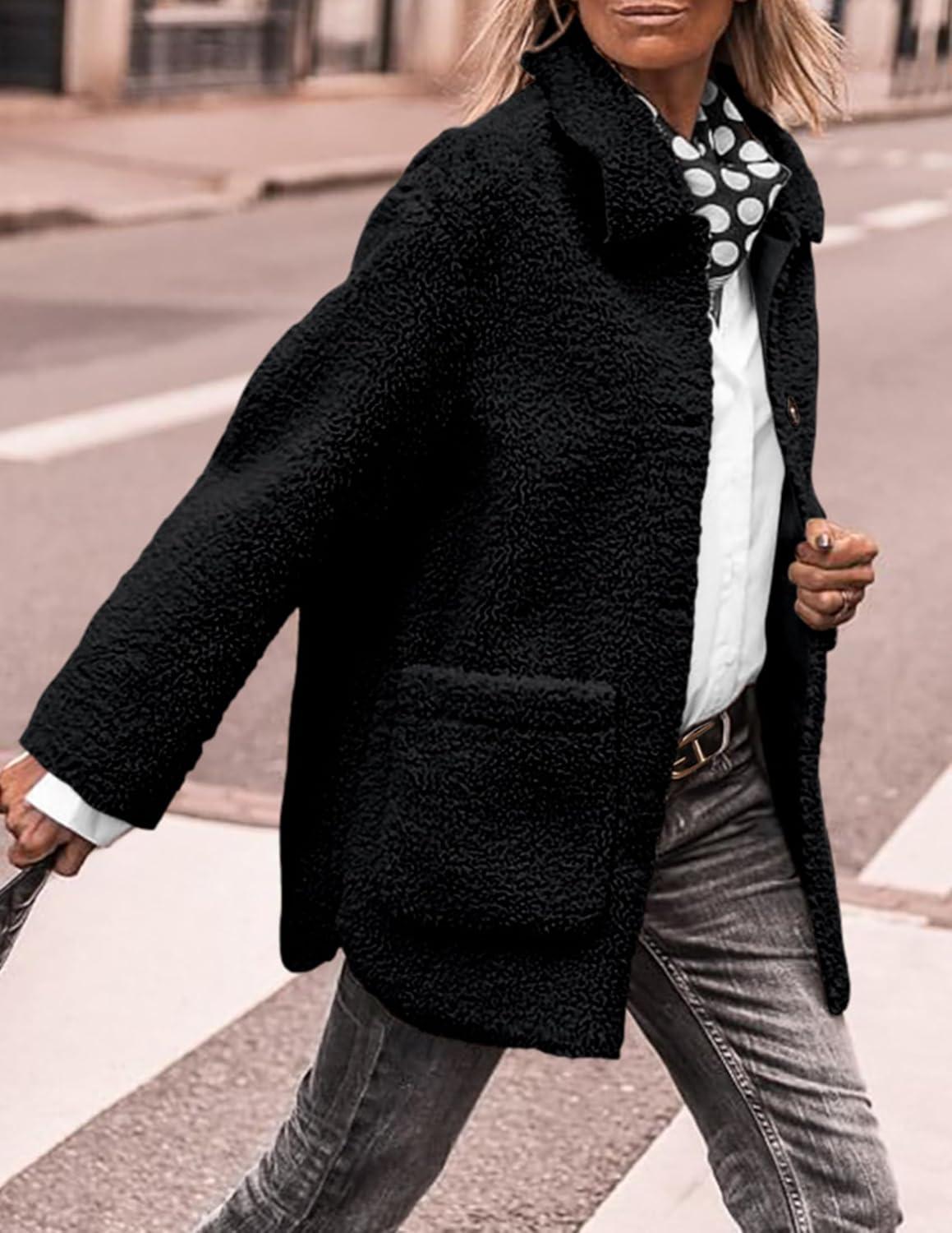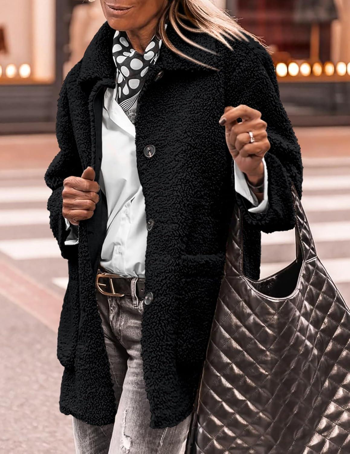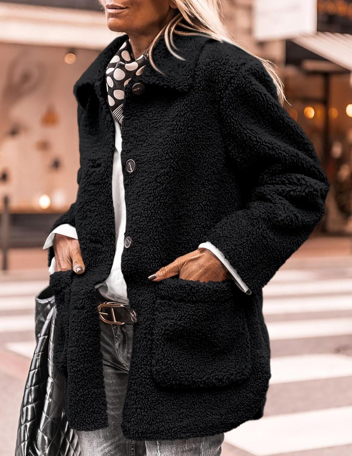 PRETTYGARDEN Women's Winter Faux Fur Coats Long Sleeve Lapel Button Down Pockets Fleece Sherpa Jacket Casual Trendy Outerwear(Black)