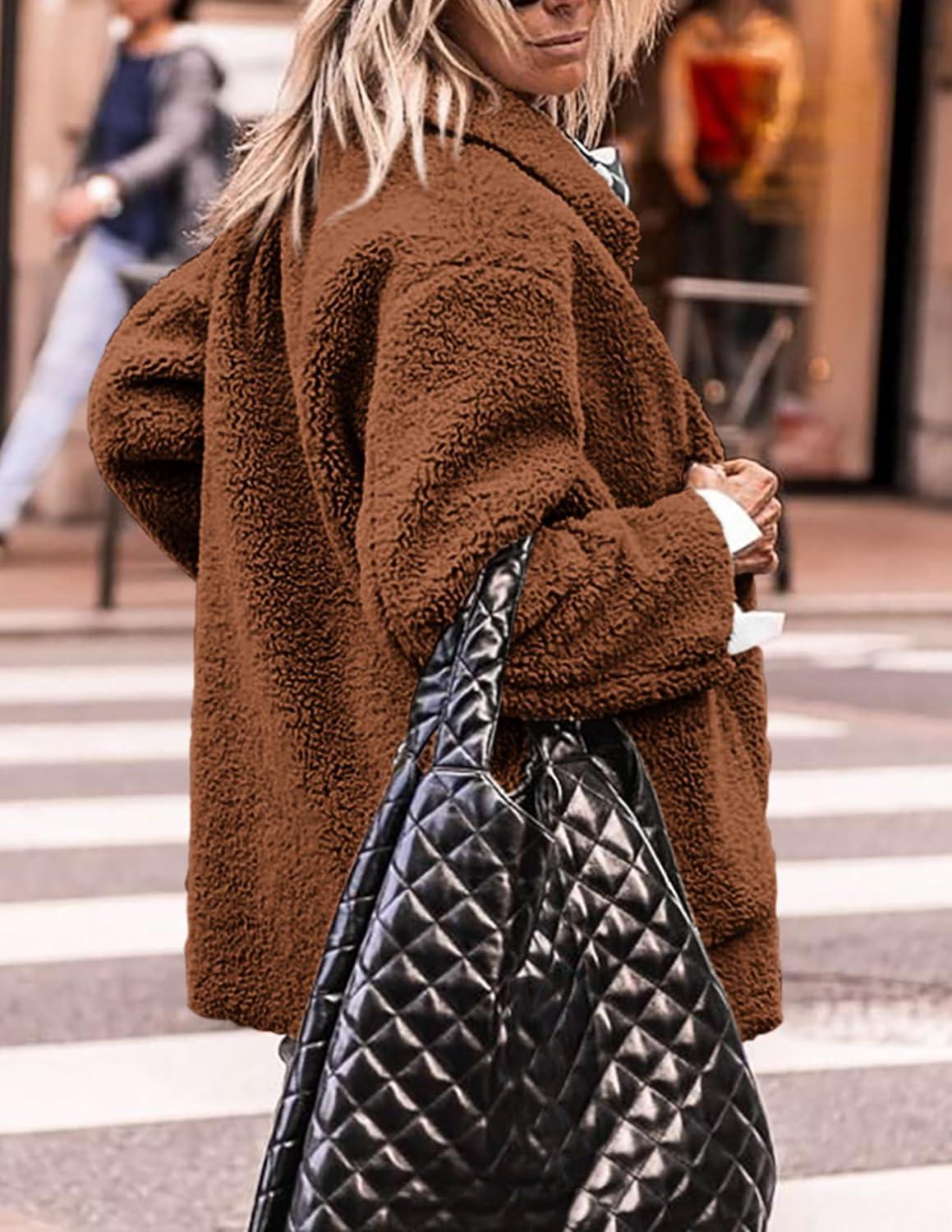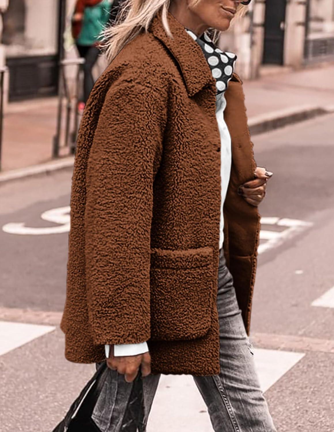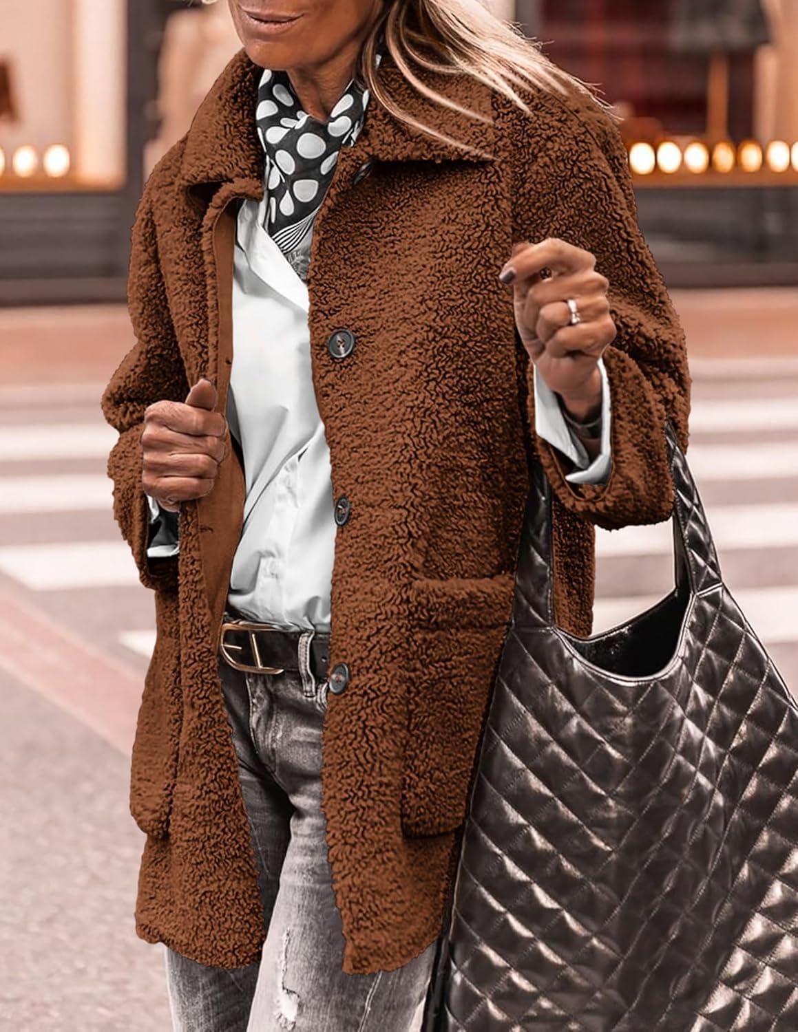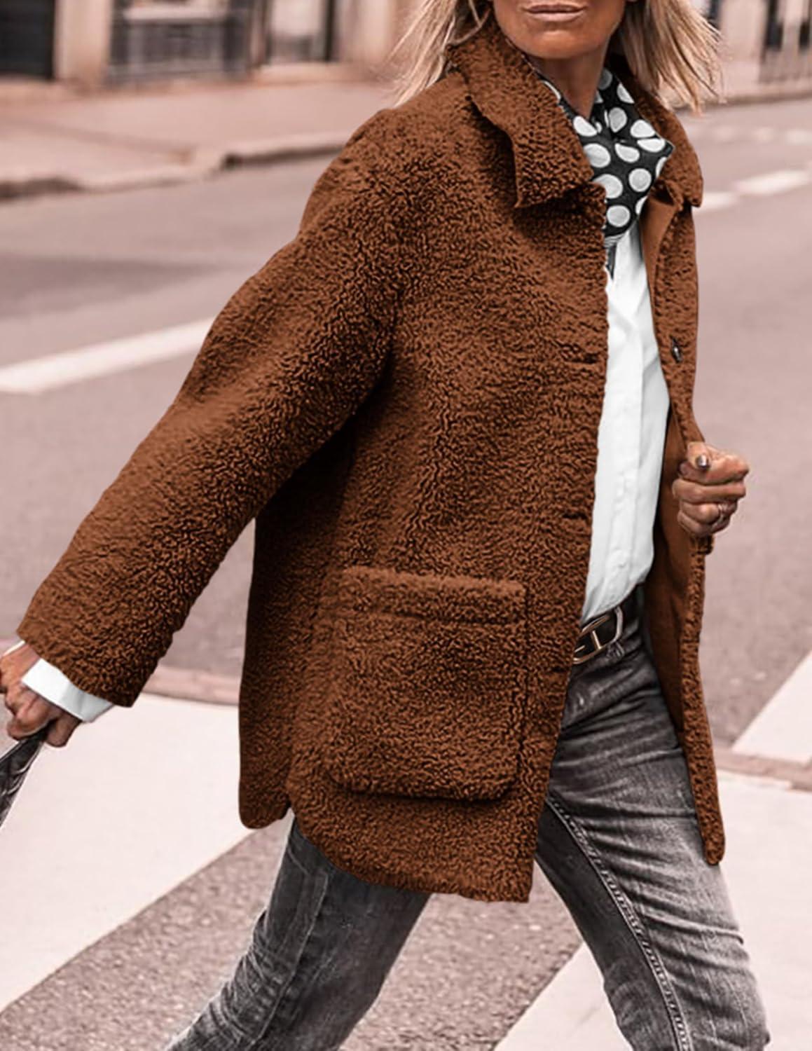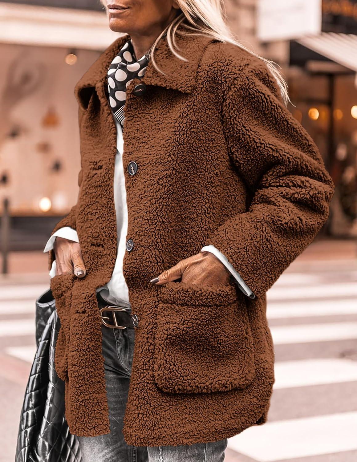 PRETTYGARDEN Women's Winter Faux Fur Coats Long Sleeve Lapel Button Down Pockets Fleece Sherpa Jacket Casual Trendy Outerwear(Brown)