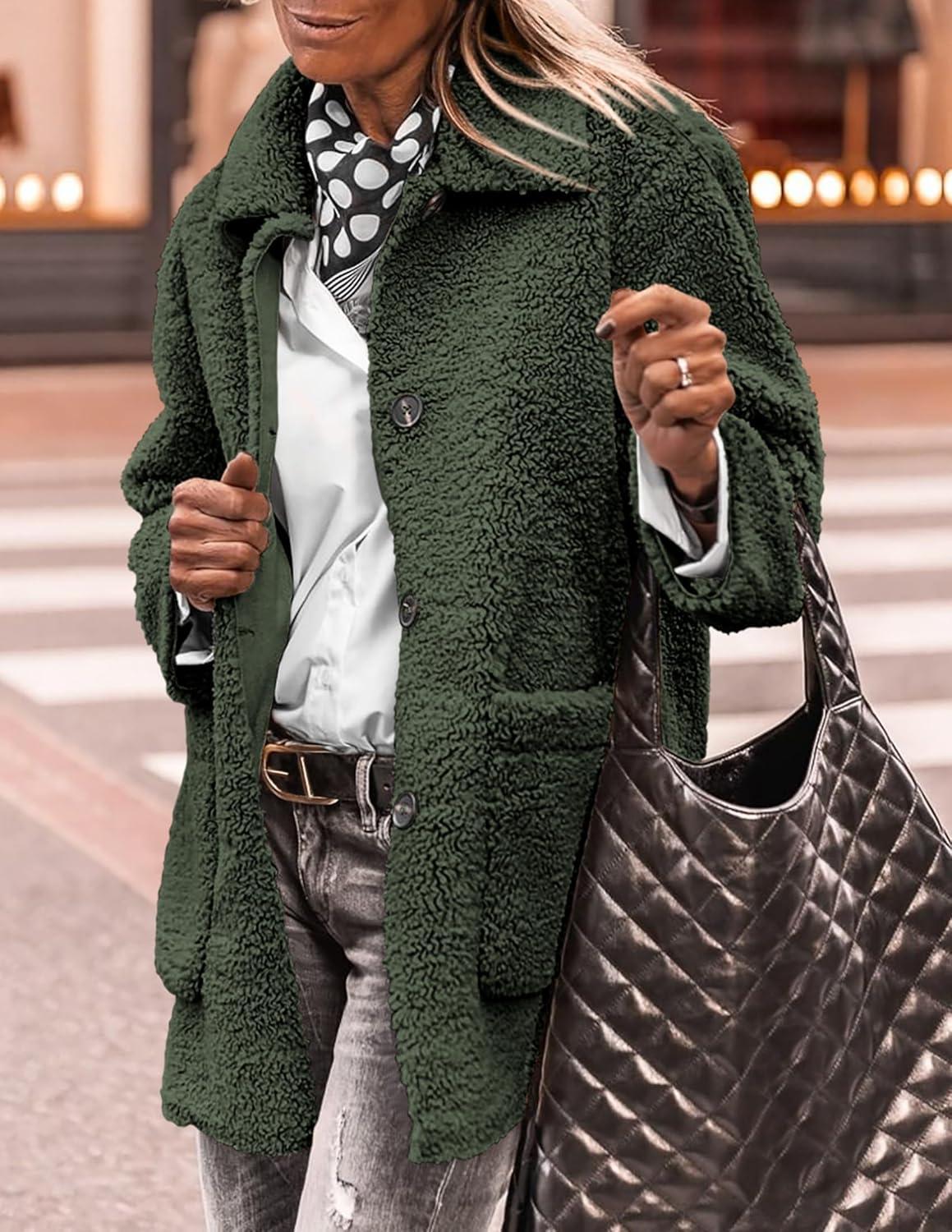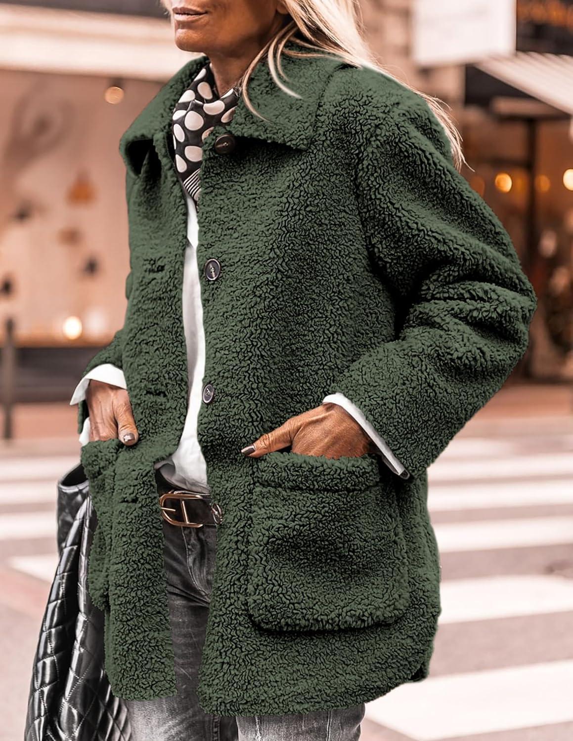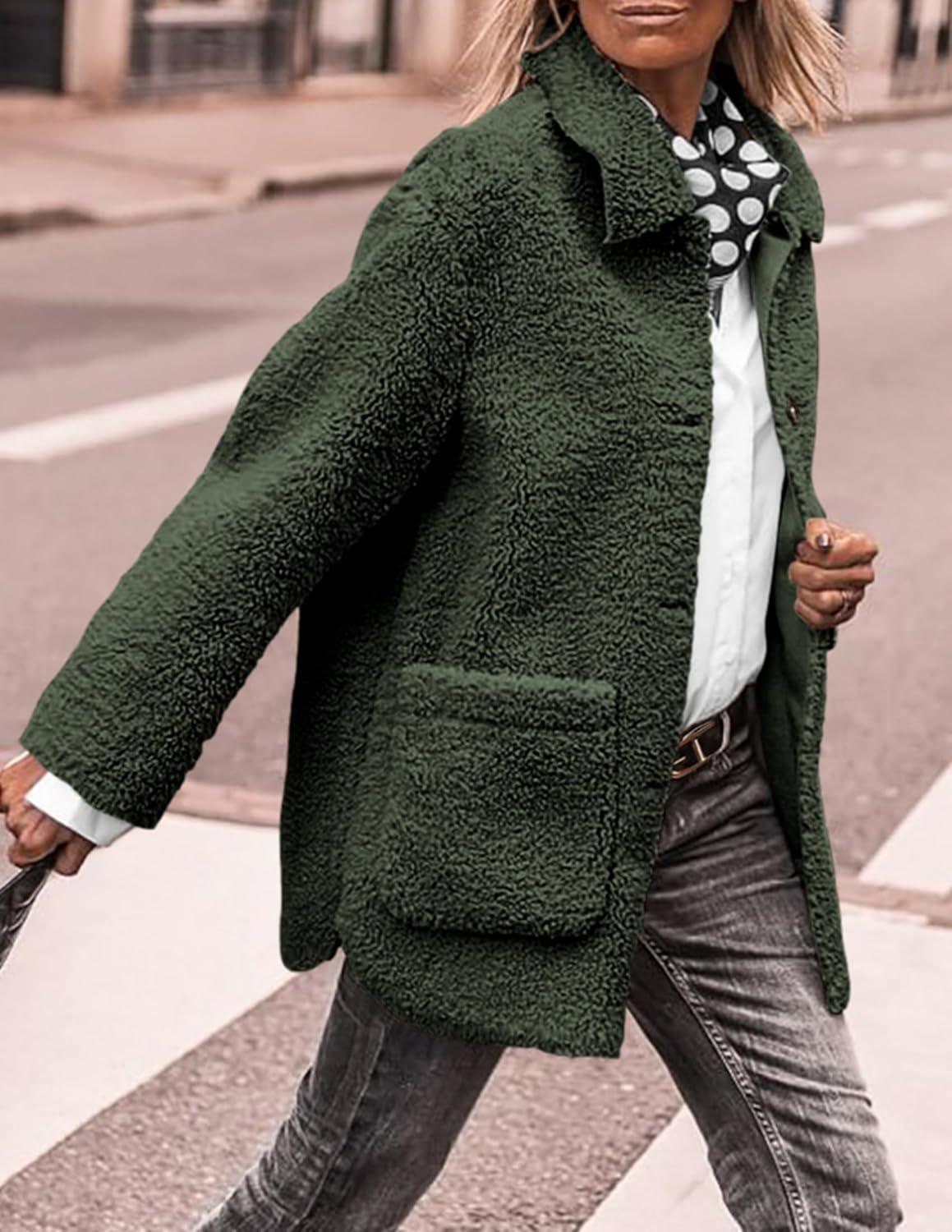 PRETTYGARDEN Women's Winter Faux Fur Coats Long Sleeve Lapel Button Down Pockets Fleece Sherpa Jacket Casual Trendy Outerwear(Dark Army Green)