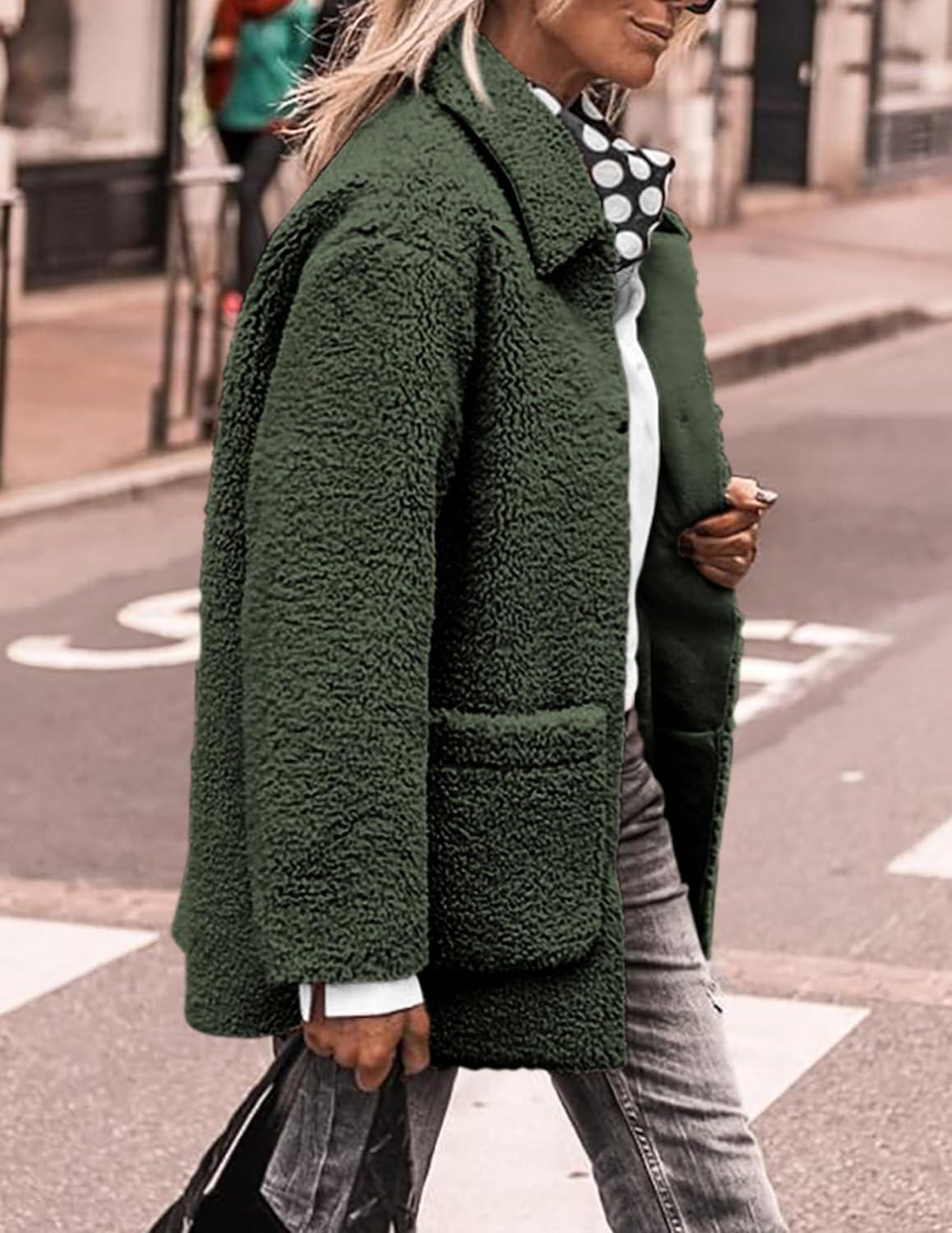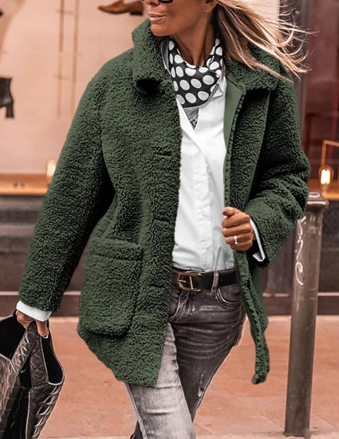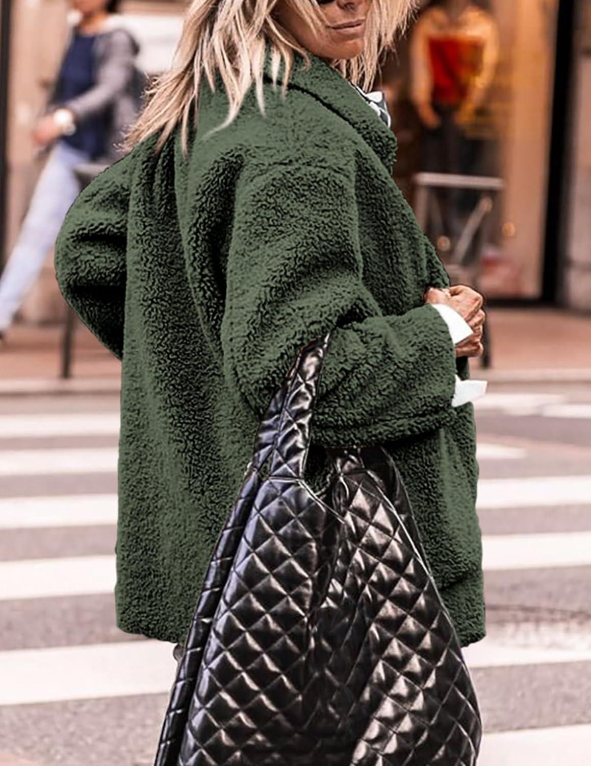 PRETTYGARDEN Women's Winter Faux Fur Coats Long Sleeve Lapel Button Down Pockets Fleece Sherpa Jacket Casual Trendy Outerwear(Dark Army Green)