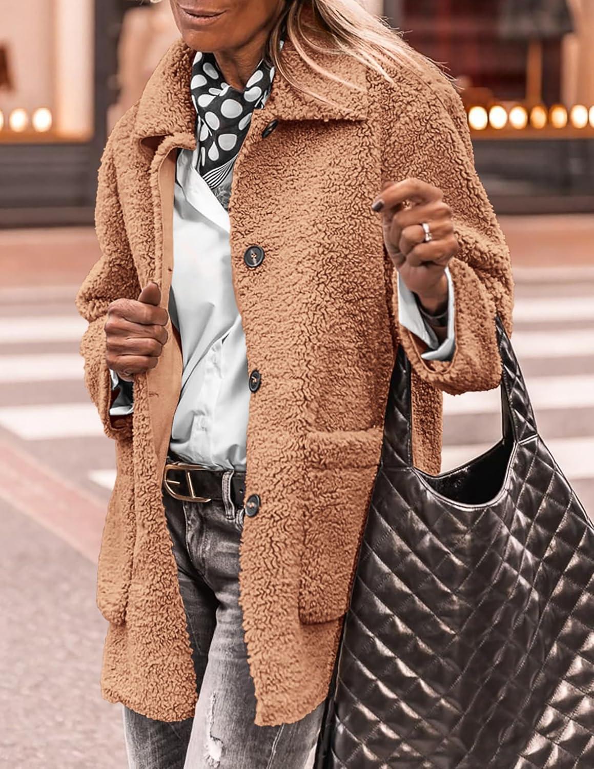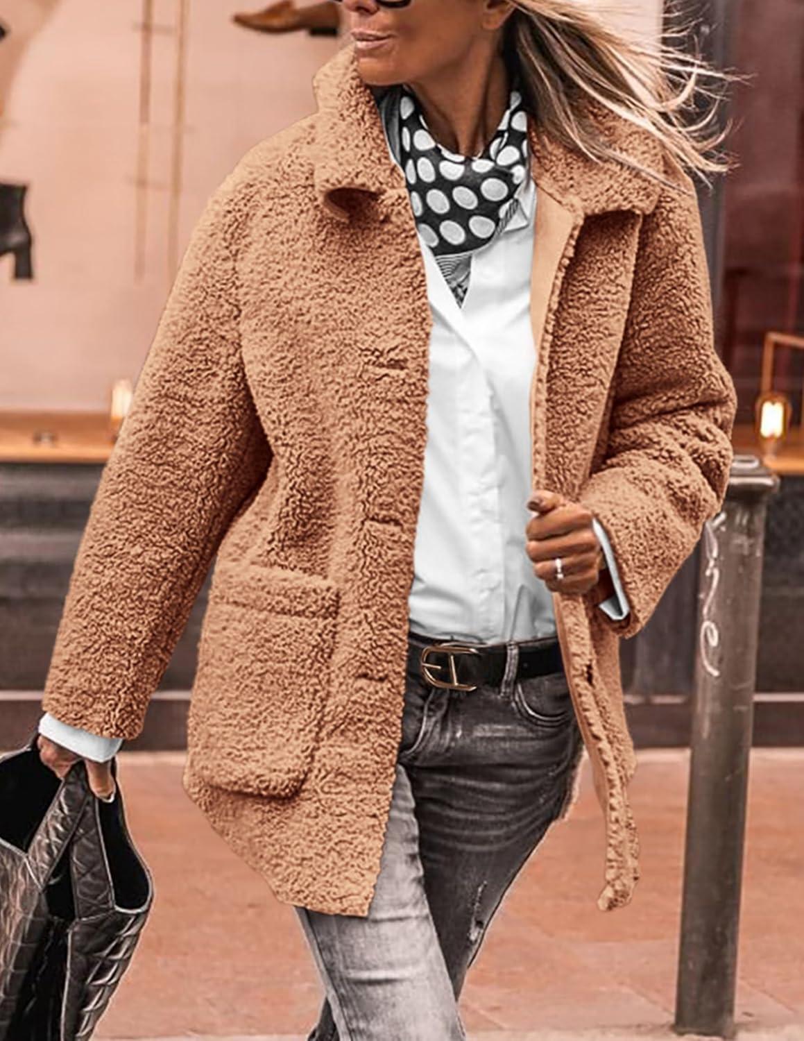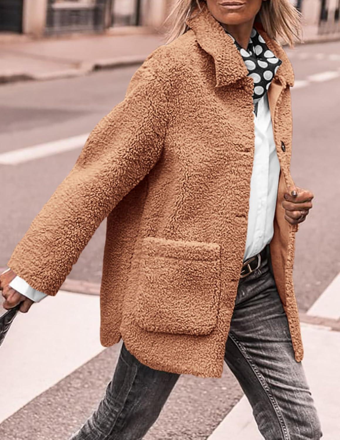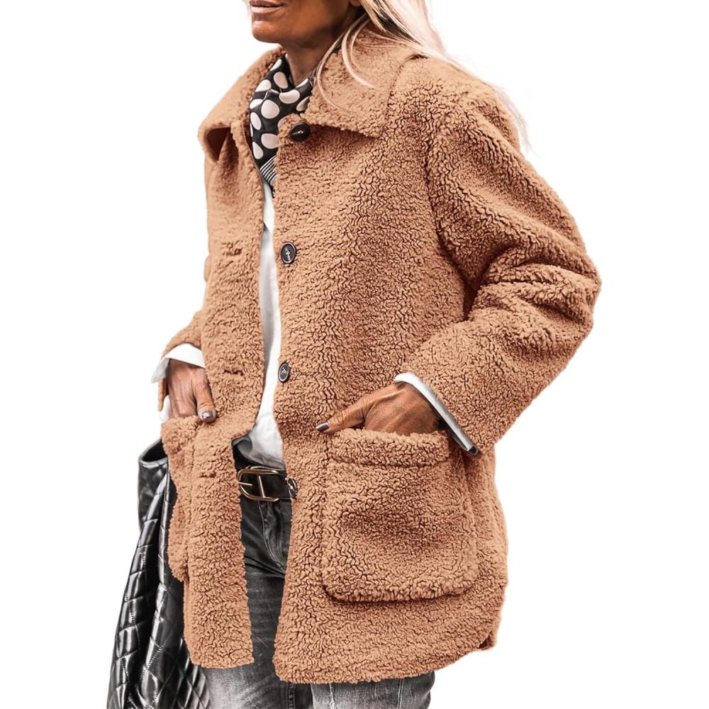 PRETTYGARDEN Women's Winter Faux Fur Coats Long Sleeve Lapel Button Down Pockets Fleece Sherpa Jacket Casual Trendy Outerwear(Khaki)