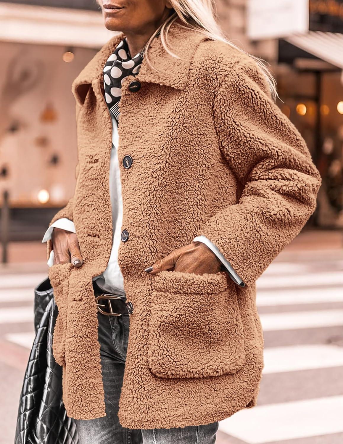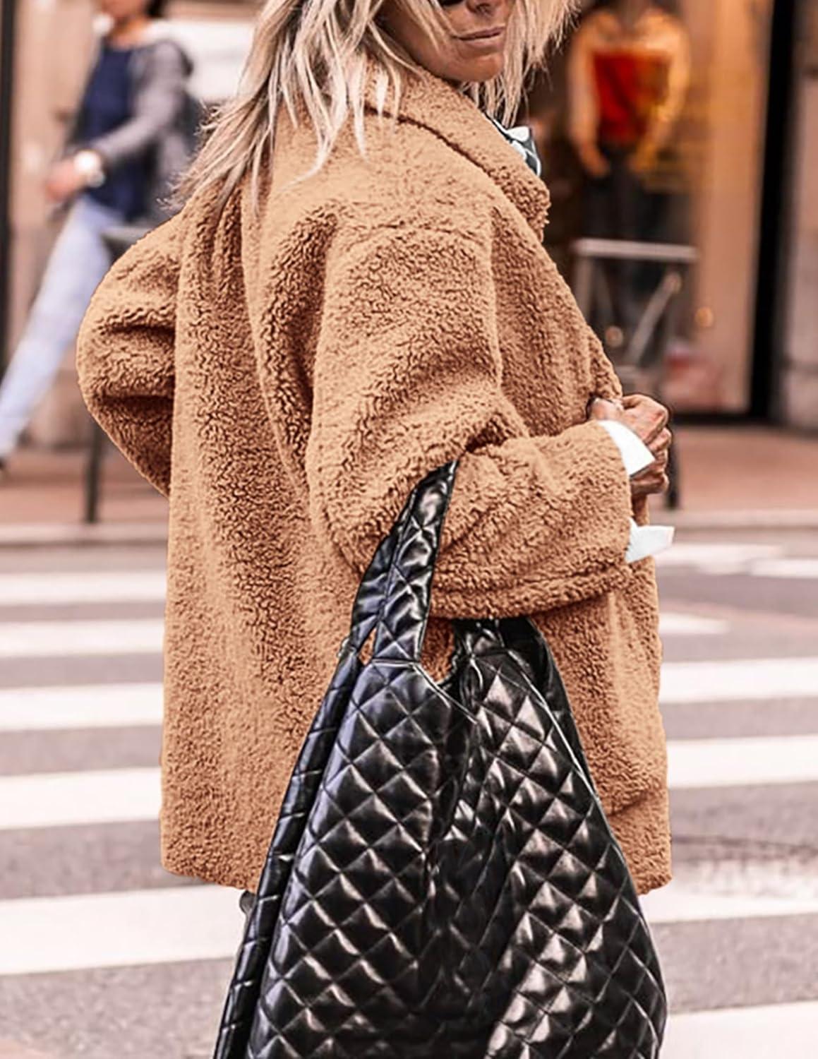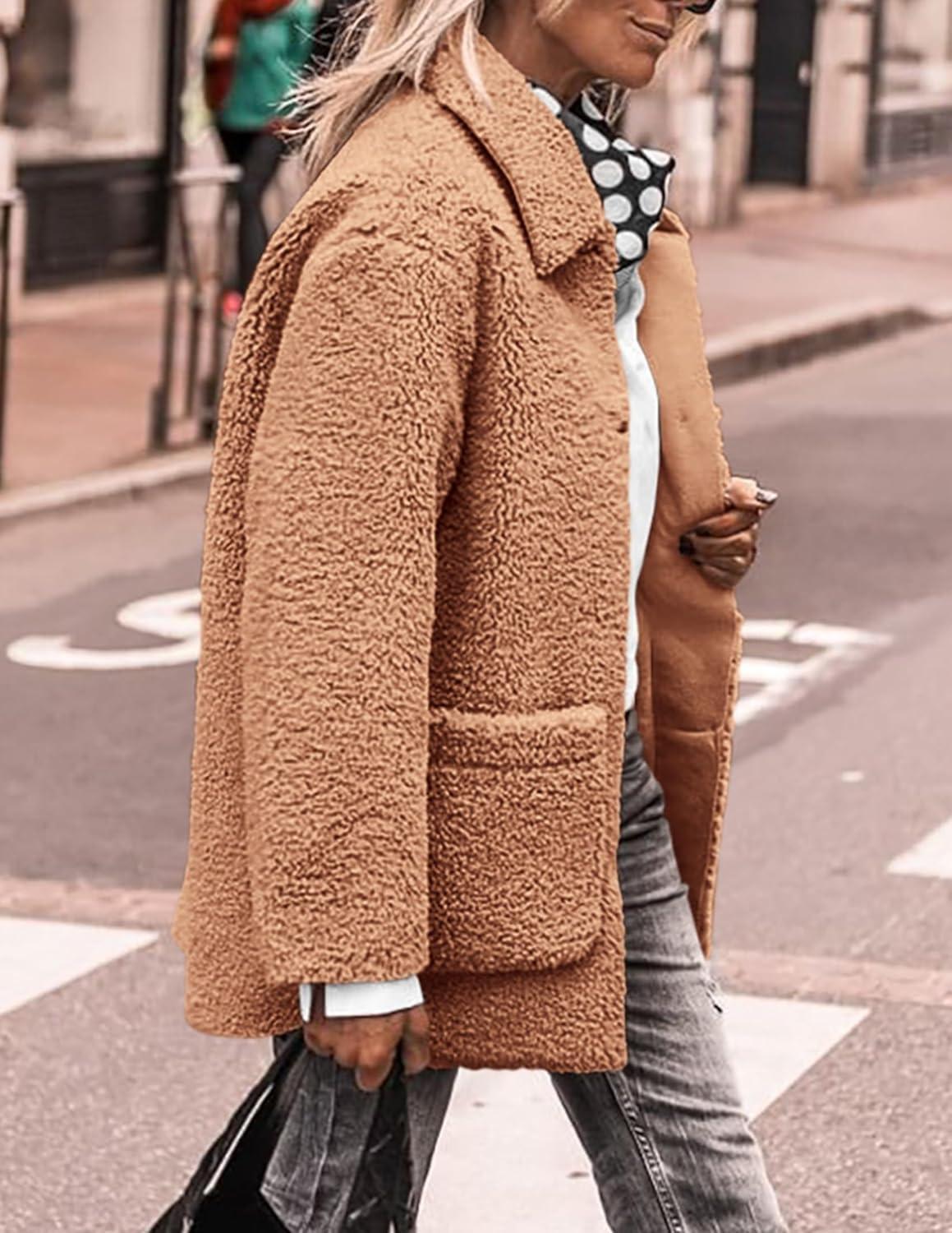PRETTYGARDEN Women's Winter Faux Fur Coats Long Sleeve Lapel Button Down Pockets Fleece Sherpa Jacket Casual Trendy Outerwear(Khaki)
