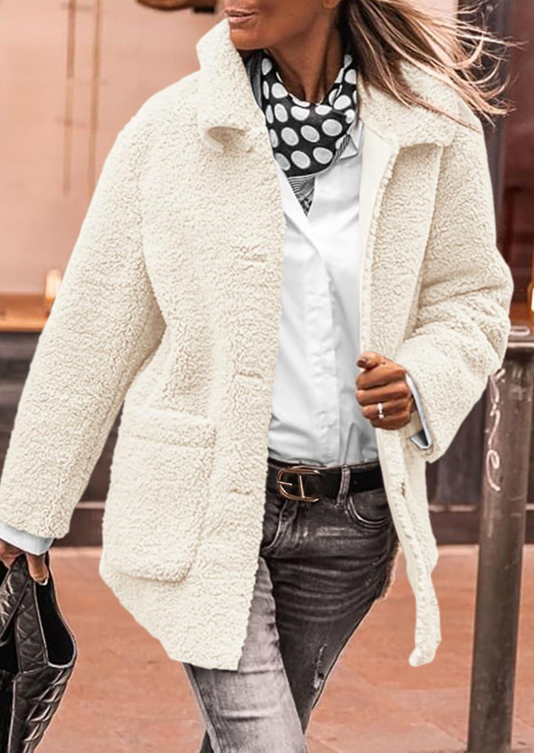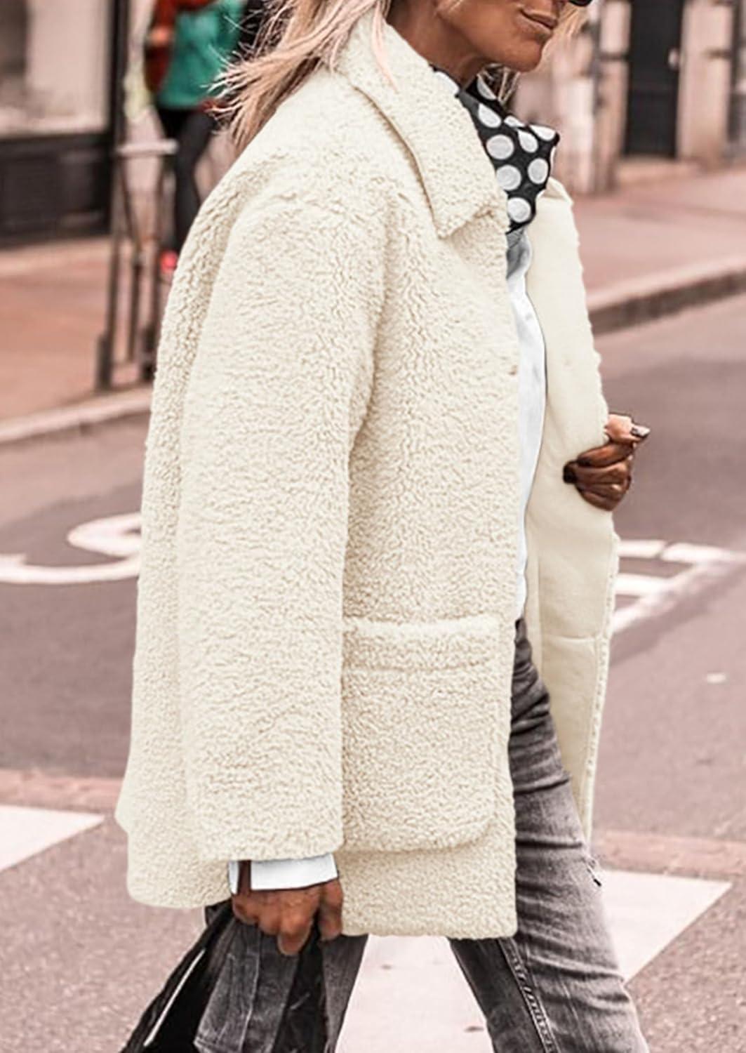 PRETTYGARDEN Women’s Winter Faux Fur Coats Long Sleeve Lapel Button Down Pockets Fleece Sherpa Jacket Casual Trendy Outerwear(White)