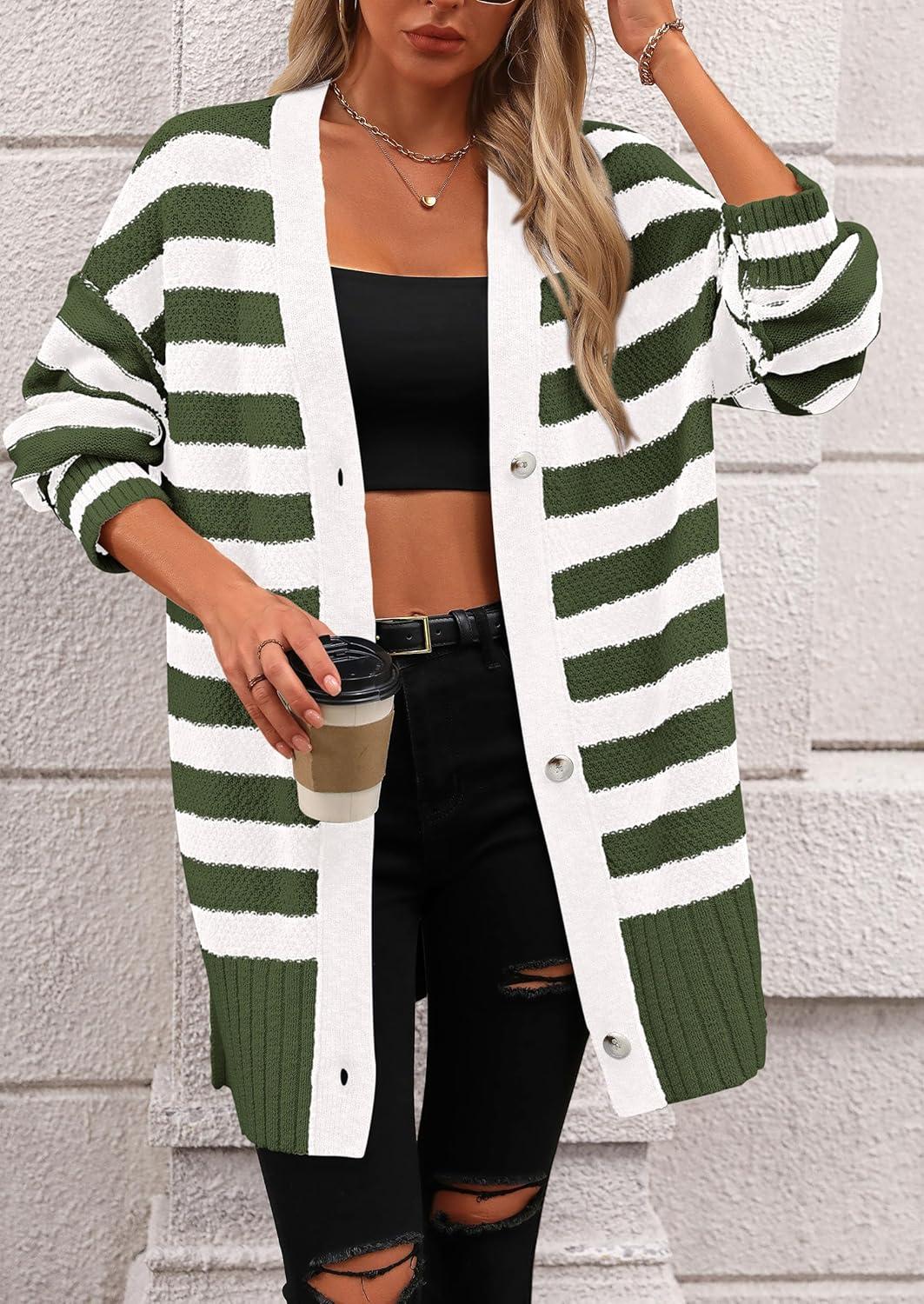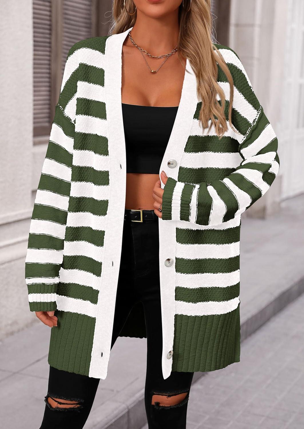 PRETTYGARDEN Women's Winter Striped Cardigan Sweaters Long Sleeve Button Down Open Front Chunky Knit Oversized Sweater Coat(Striped Army Green White)