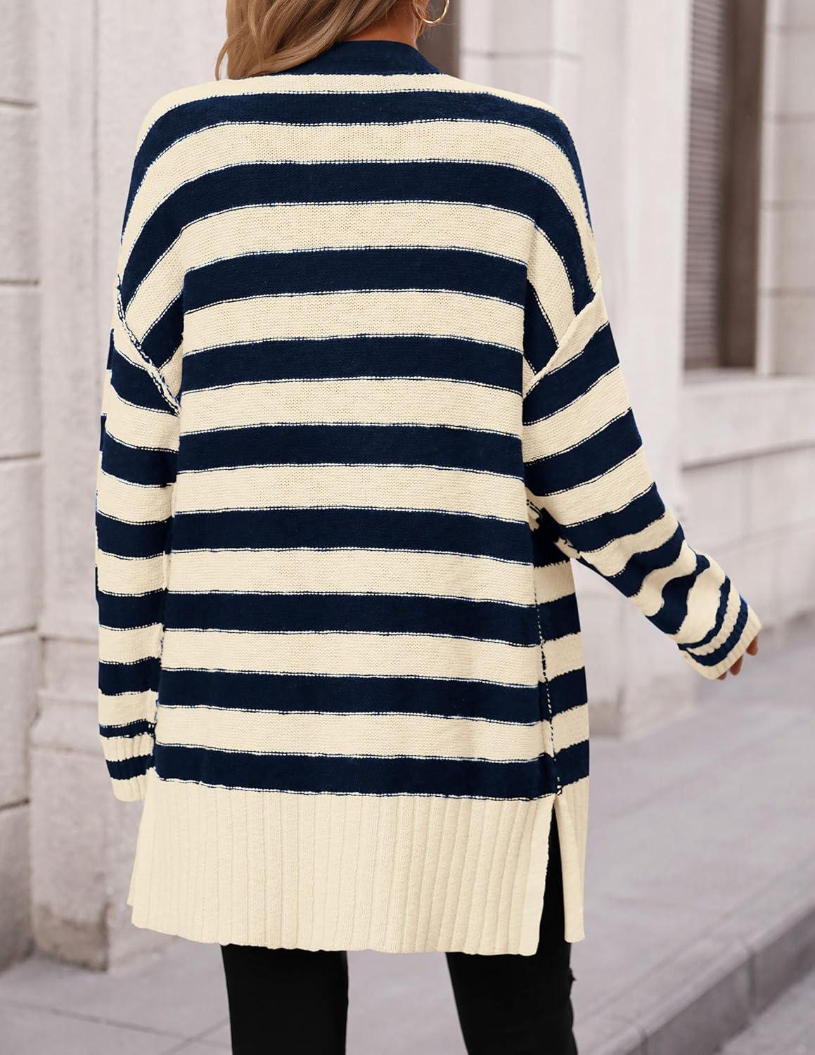 PRETTYGARDEN Women's Winter Striped Cardigan Sweaters Long Sleeve Button Down Open Front Chunky Knit Oversized Sweater Coat(Striped Beige Navy)