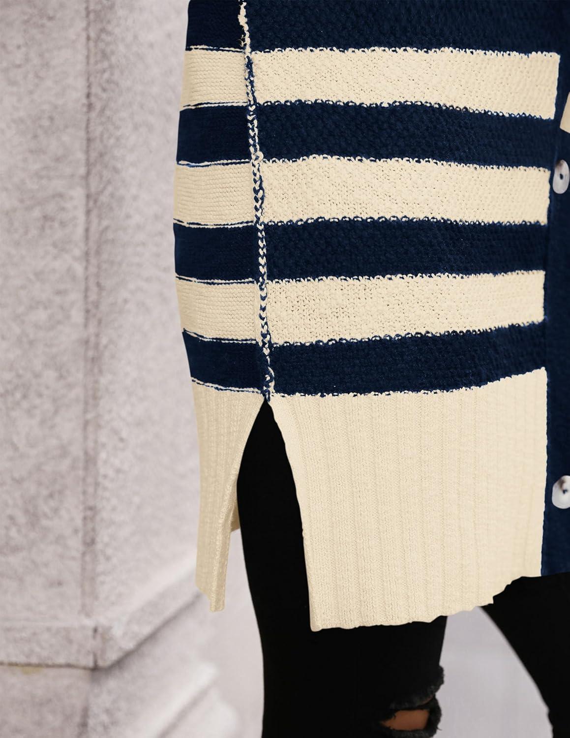 PRETTYGARDEN Women’s Winter Striped Cardigan Sweaters Long Sleeve Button Down Open Front Chunky Knit Oversized Sweater Coat(Striped Beige Navy)