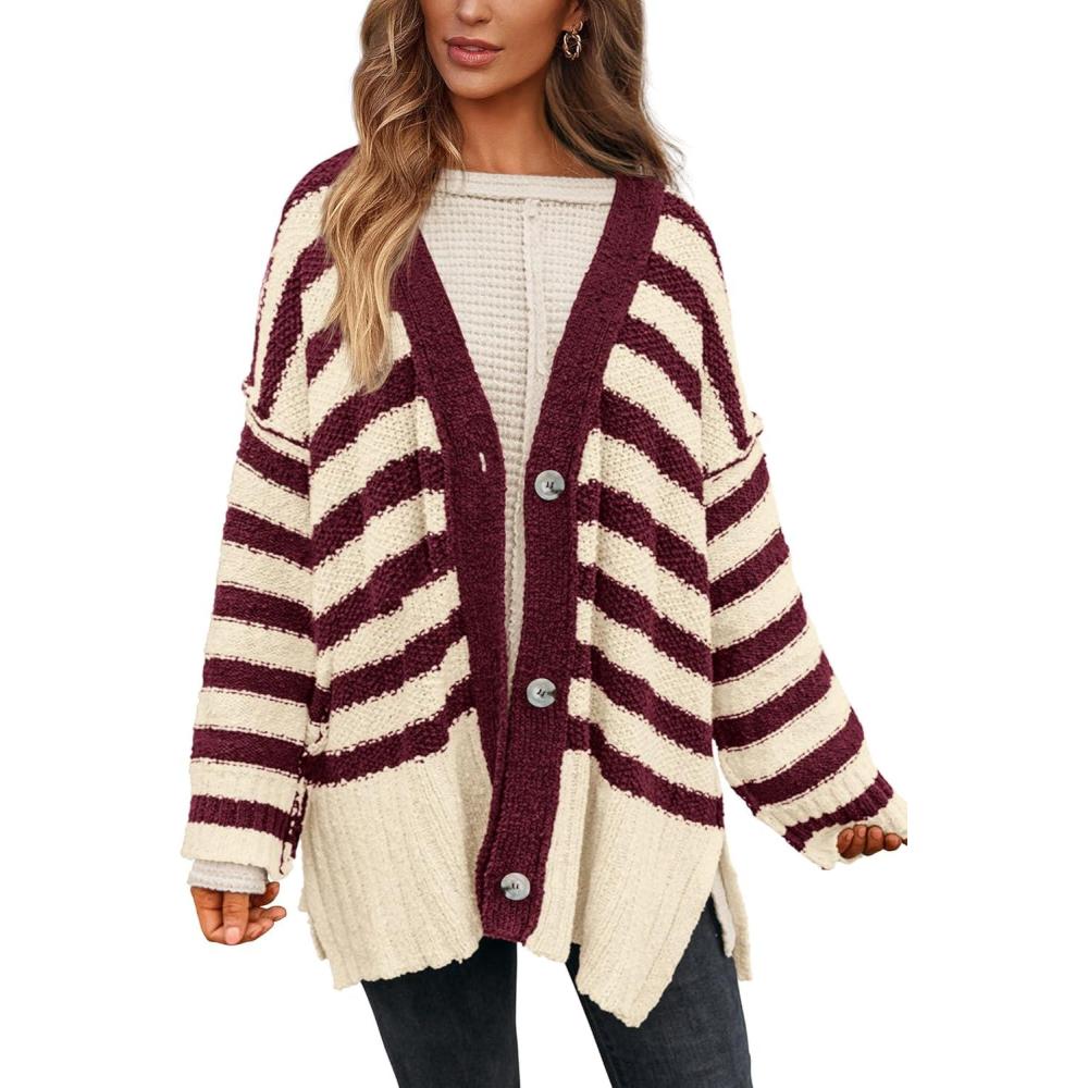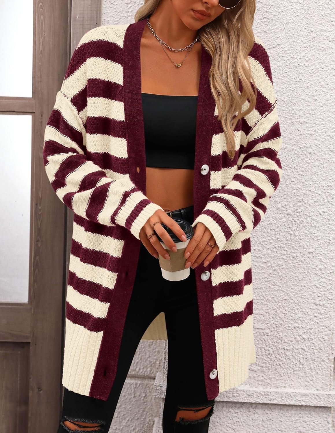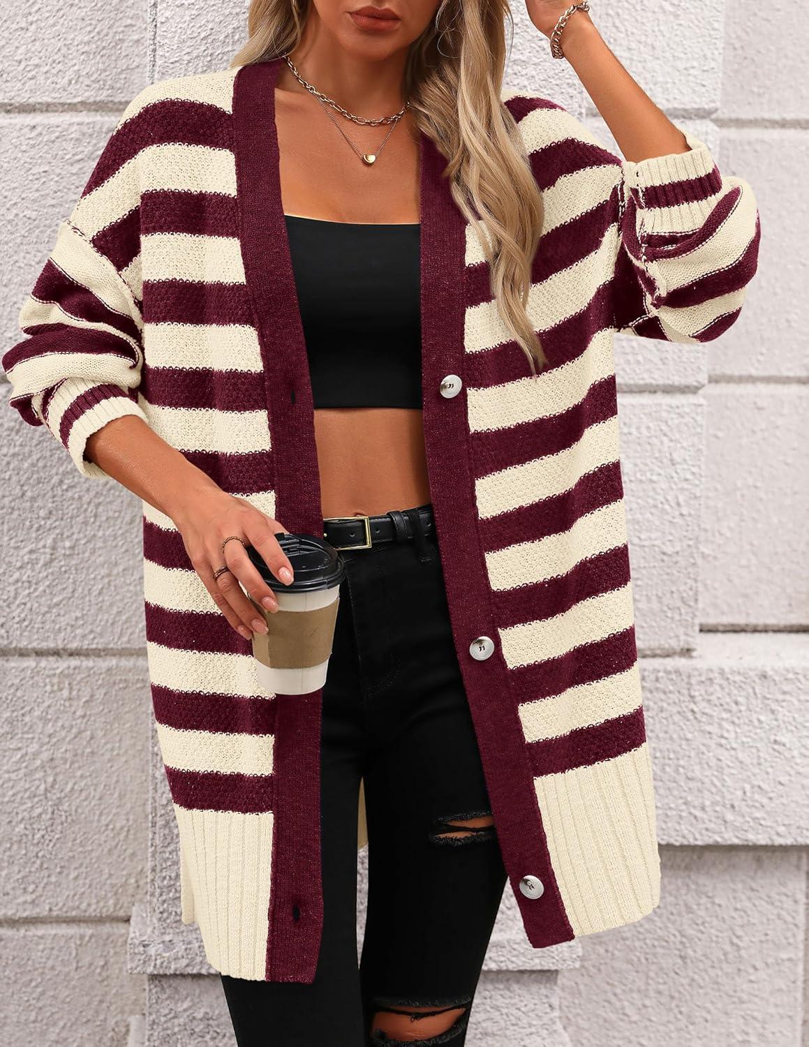 PRETTYGARDEN Women’s Winter Striped Cardigan Sweaters Long Sleeve Button Down Open Front Chunky Knit Oversized Sweater Coat(Striped Beige Wine Red)
