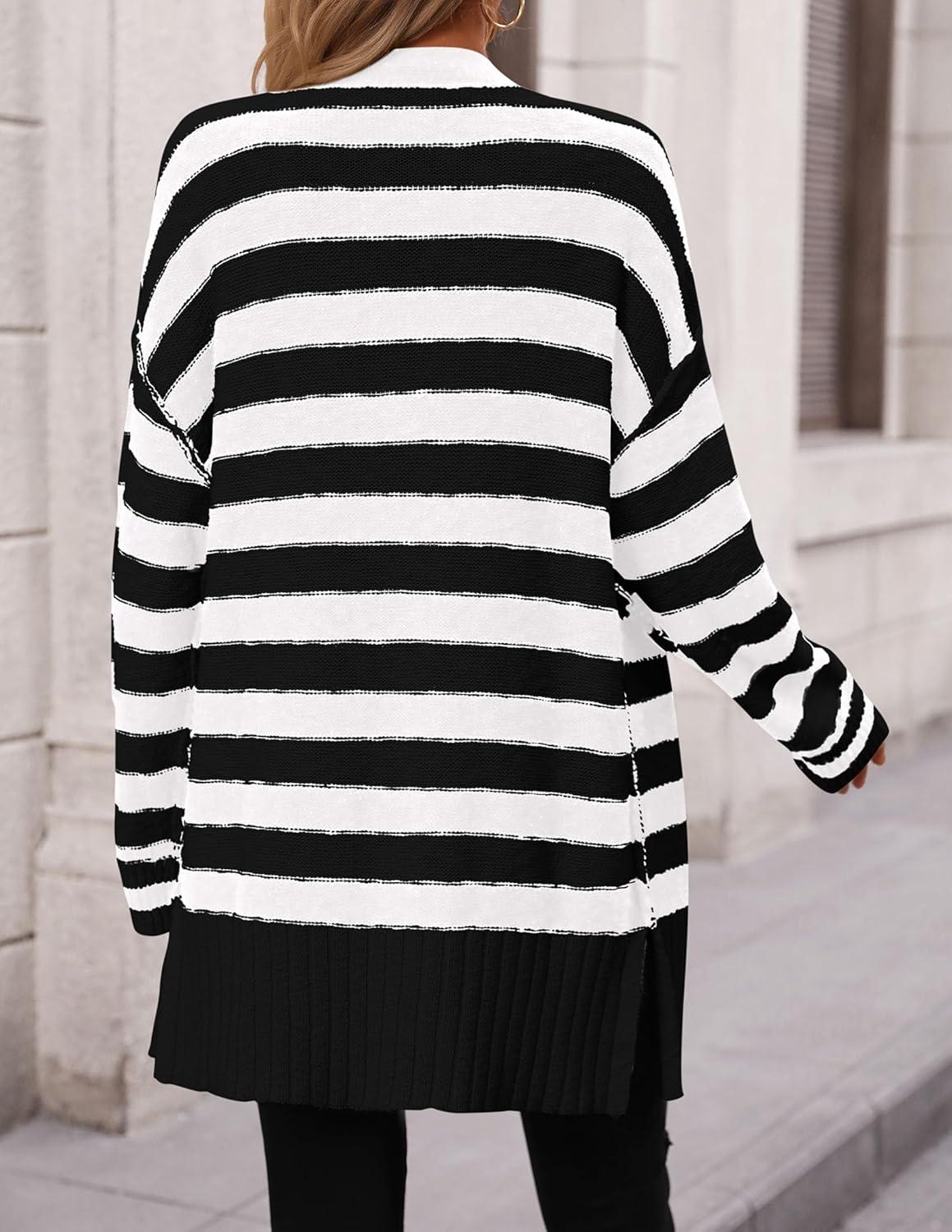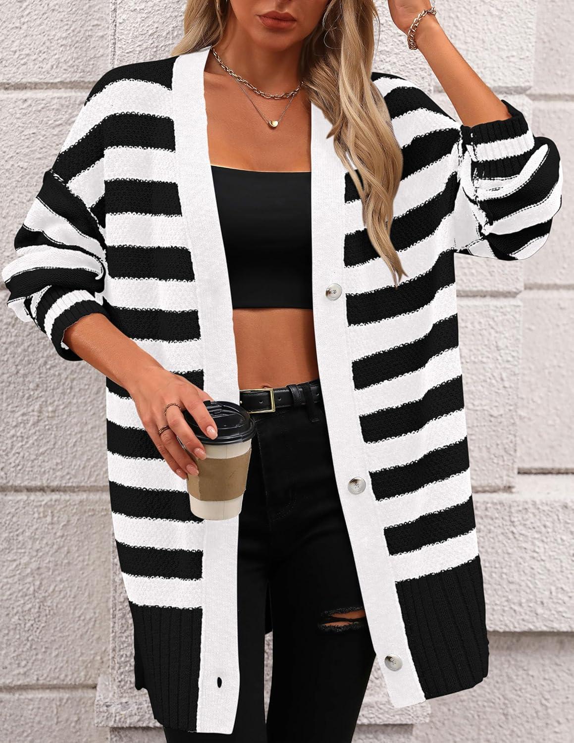 PRETTYGARDEN Women's Winter Striped Cardigan Sweaters Long Sleeve Button Down Open Front Chunky Knit Oversized Sweater Coat(Striped Black White)