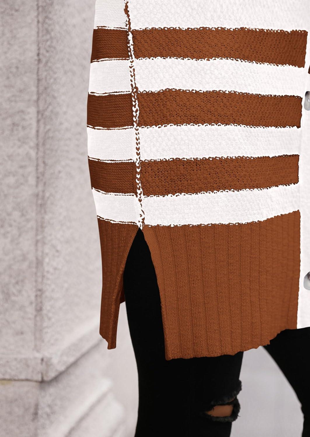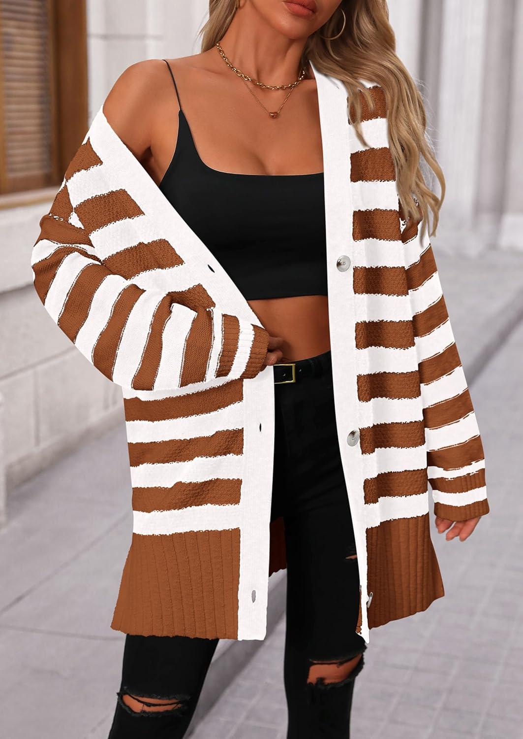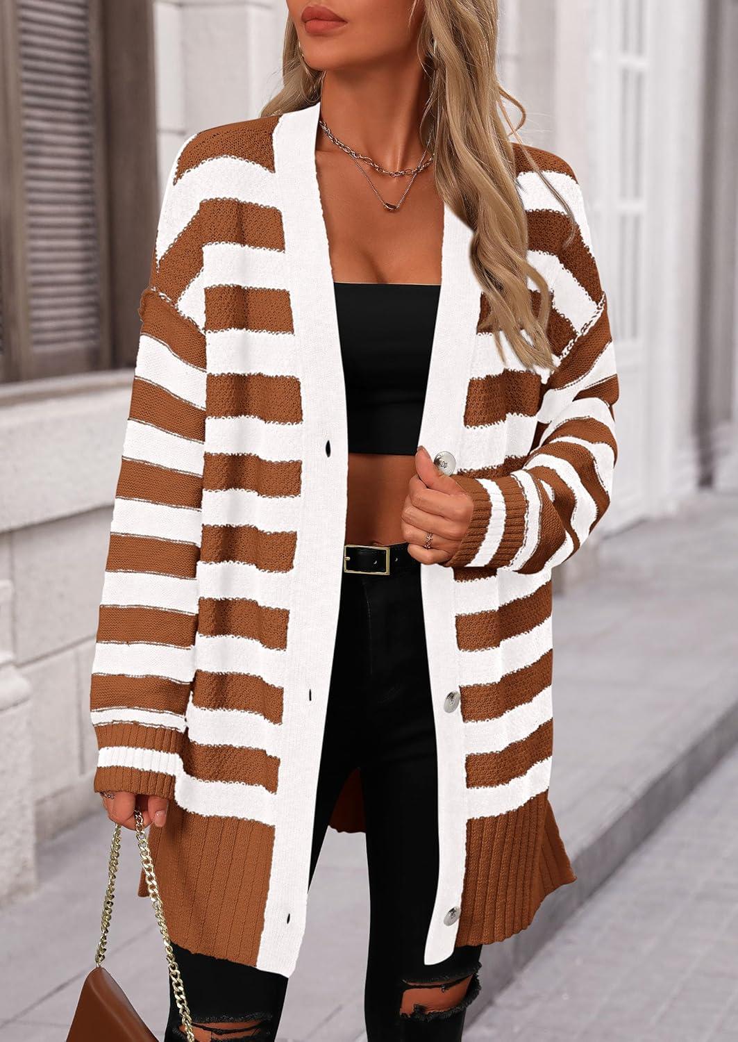 PRETTYGARDEN Women's Winter Striped Cardigan Sweaters Long Sleeve Button Down Open Front Chunky Knit Oversized Sweater Coat(Striped Brown White)