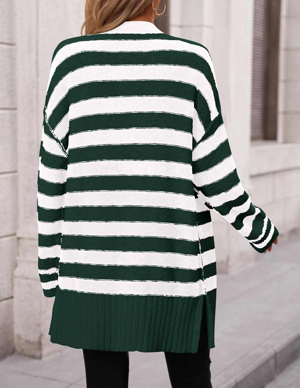 PRETTYGARDEN Women's Winter Striped Cardigan Sweaters Long Sleeve Button Down Open Front Chunky Knit Oversized Sweater Coat(Striped Dark Green White)