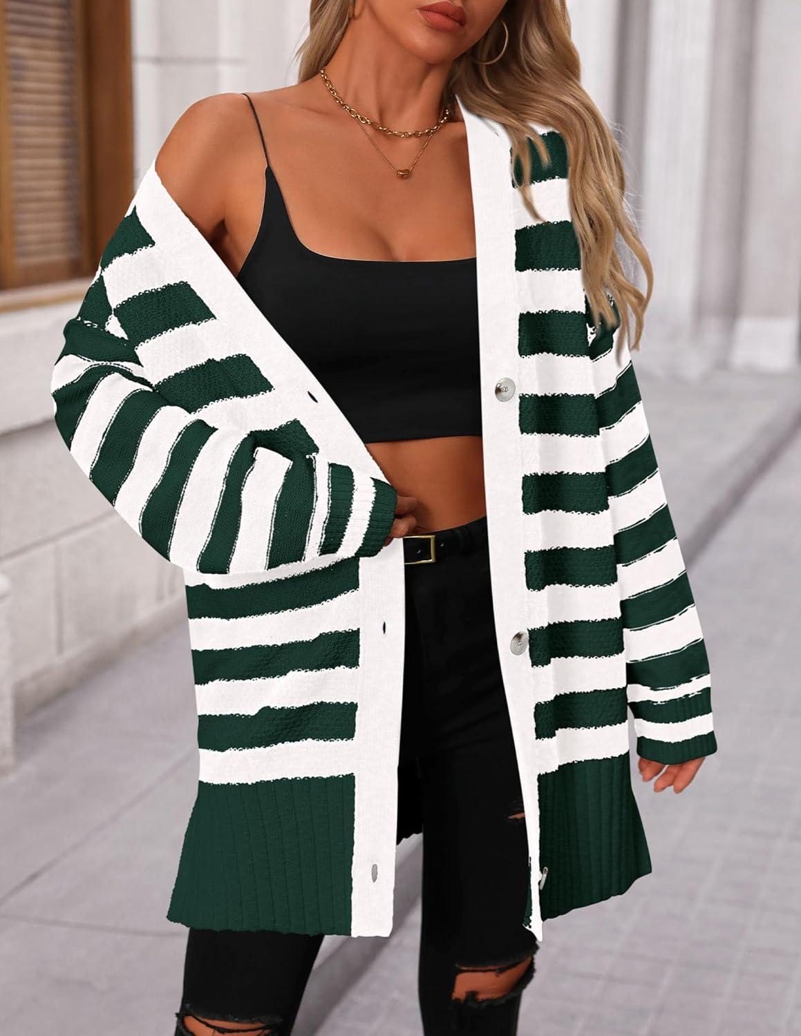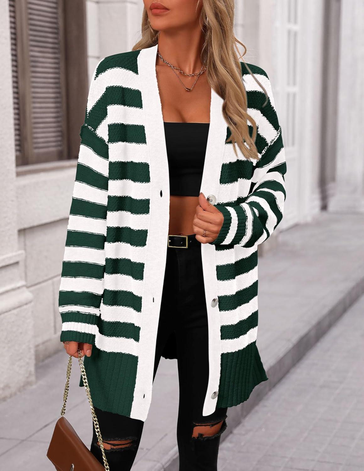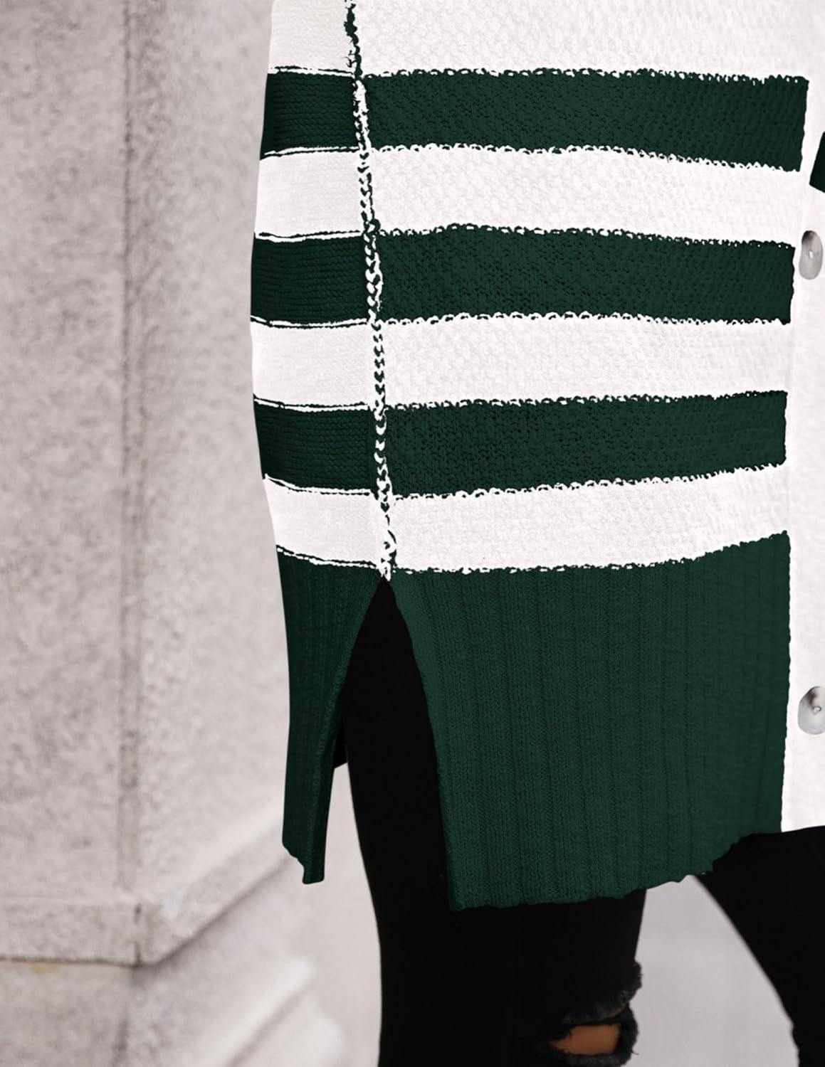 PRETTYGARDEN Women’s Winter Striped Cardigan Sweaters Long Sleeve Button Down Open Front Chunky Knit Oversized Sweater Coat(Striped Dark Green White)