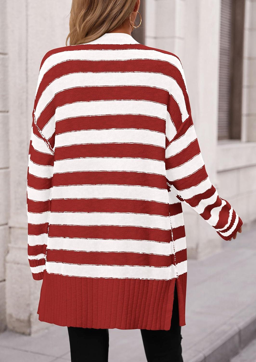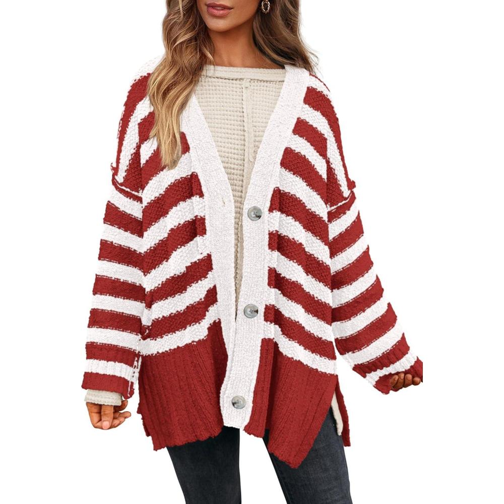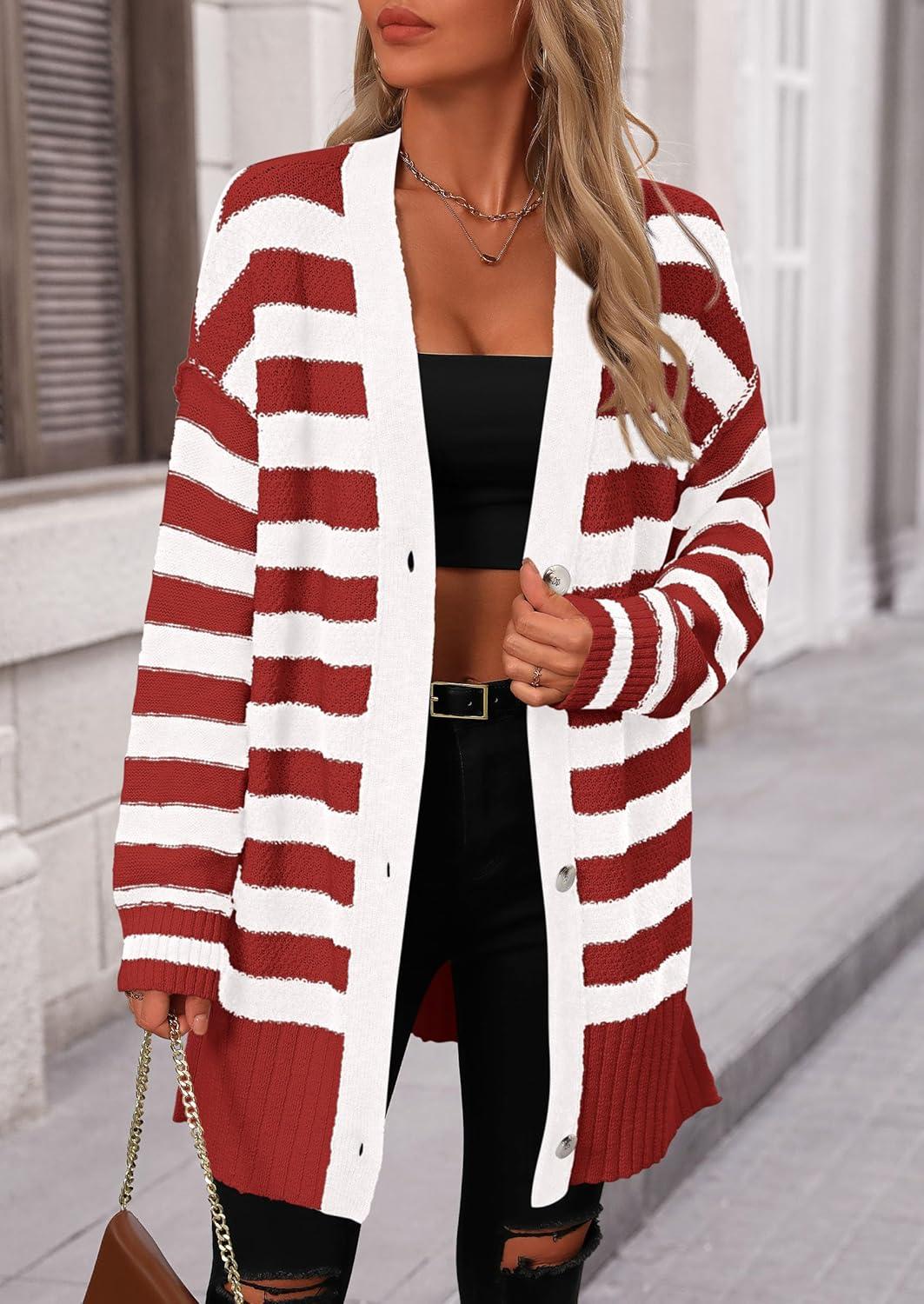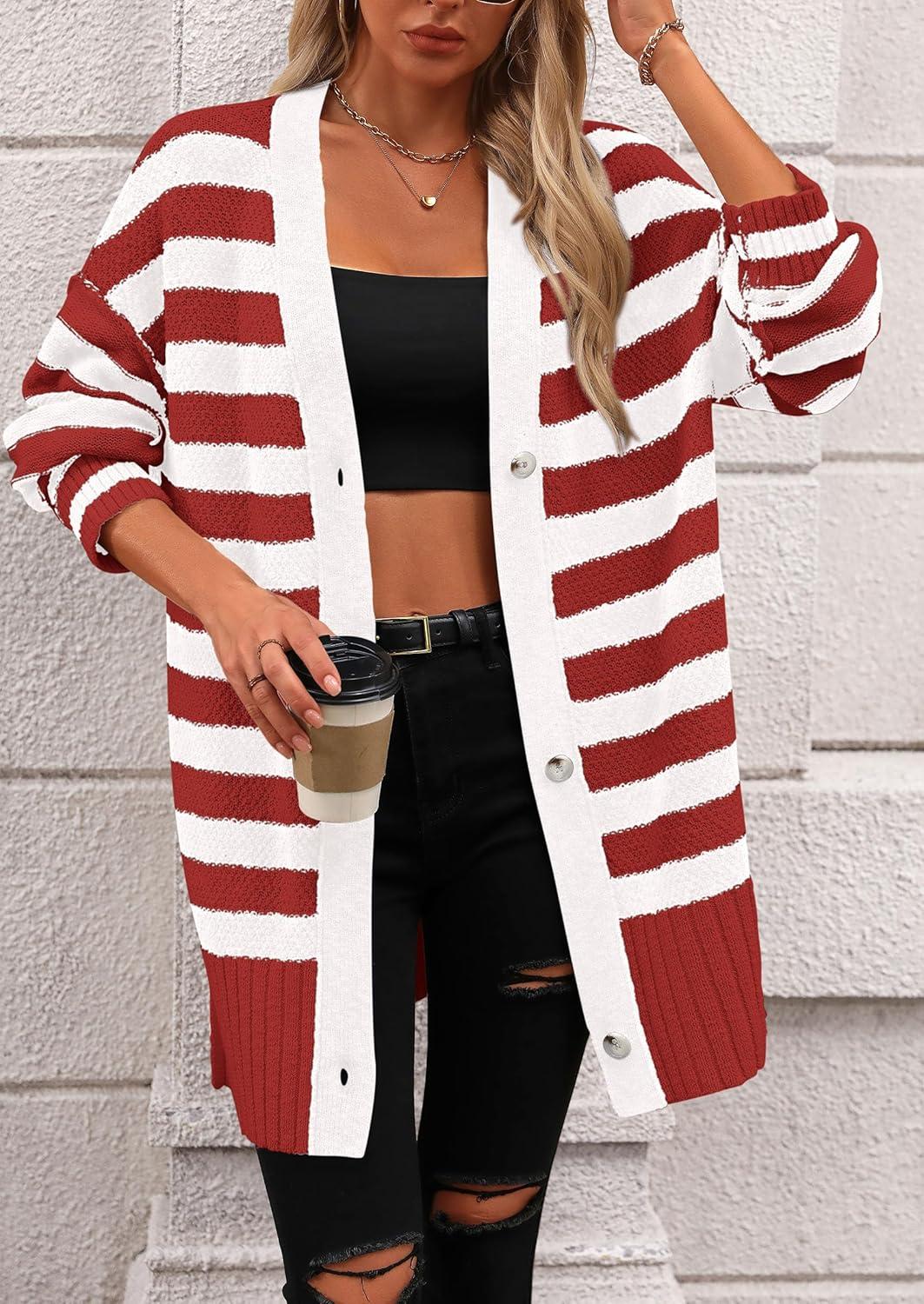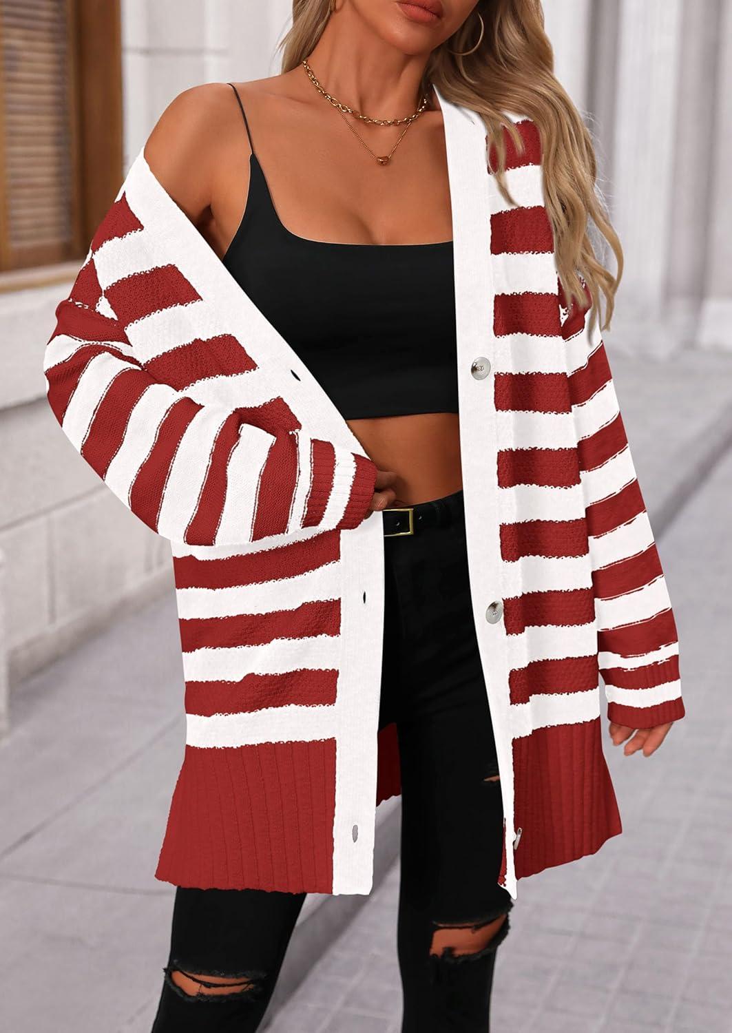 PRETTYGARDEN Women's Winter Striped Cardigan Sweaters Long Sleeve Button Down Open Front Chunky Knit Oversized Sweater Coat(Striped Rust Red White)