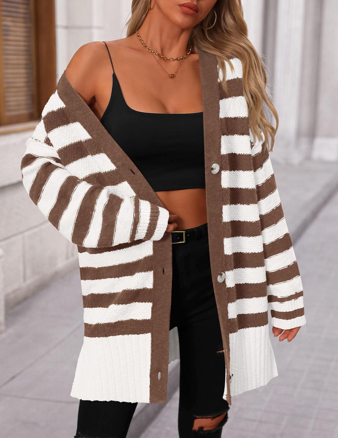 PRETTYGARDEN Women’s Winter Striped Cardigan Sweaters Long Sleeve Button Down Open Front Chunky Knit Oversized Sweater Coat(Striped White Coffee)